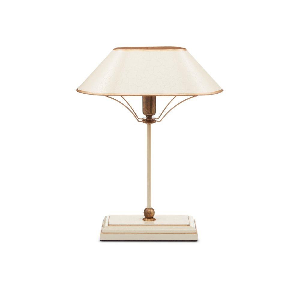 The Daphne Table Lamp looks as if it is made of one material in three distinctive finishes but the base is made of wood while the other elements on the ivory table lamp are made of wrought iron and brass in antique brass and gold finishes. The shape of the oval shade with its painted trim is a design detail worth noting.