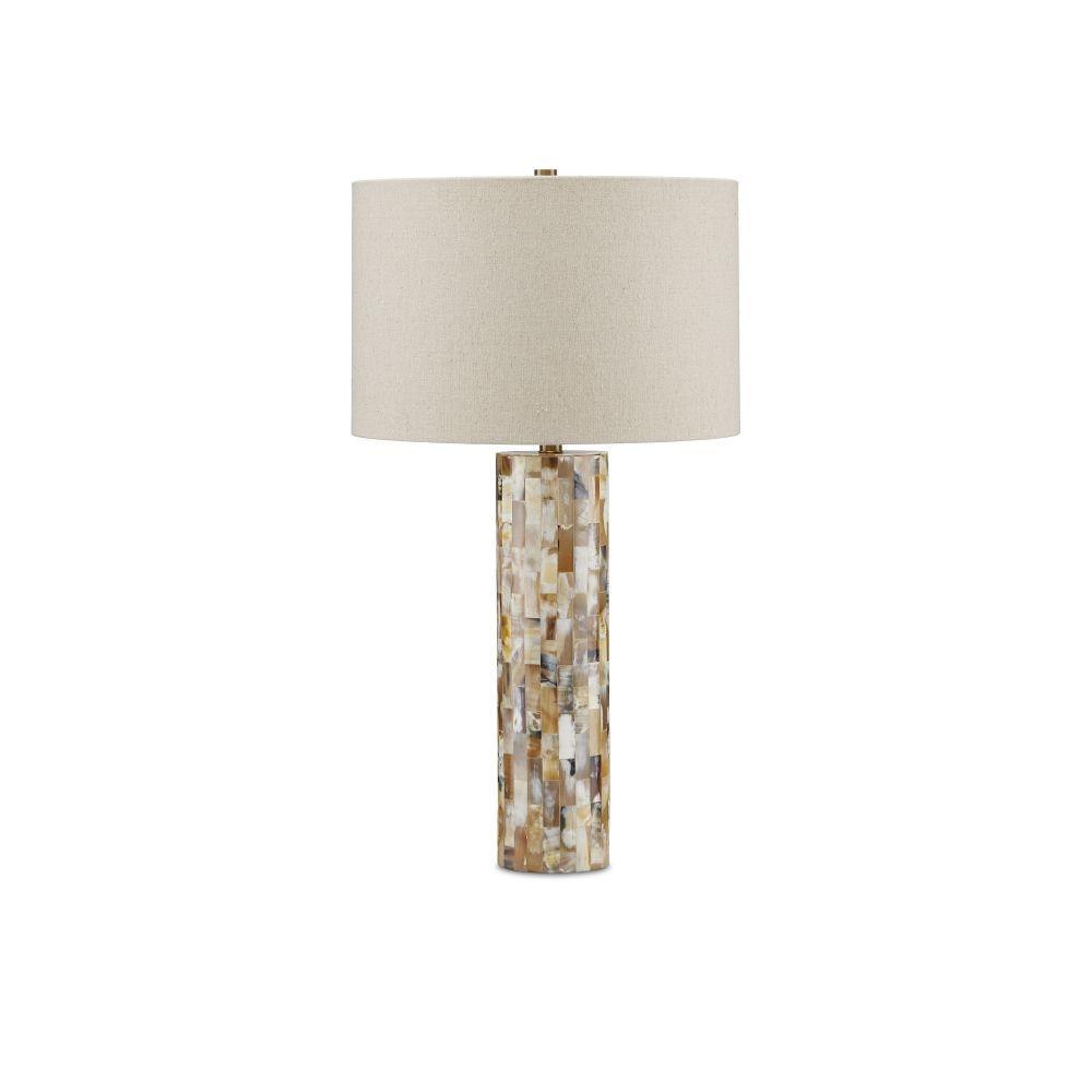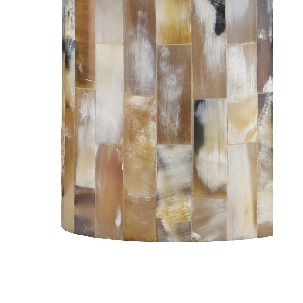 The elegant columnar body of the Colevile Table Lamp is covered in asymmetrical pieces of natural horn inlay that have been hand cut and painstakingly applied. Designed by Pam Bailey and Christina Pomroy, they chose a shinier type of horn in order to give this tan lamp a heavy dose of sheen. The Colevile is topped with an oatmeal linen shade that is fastened with a brass finial.