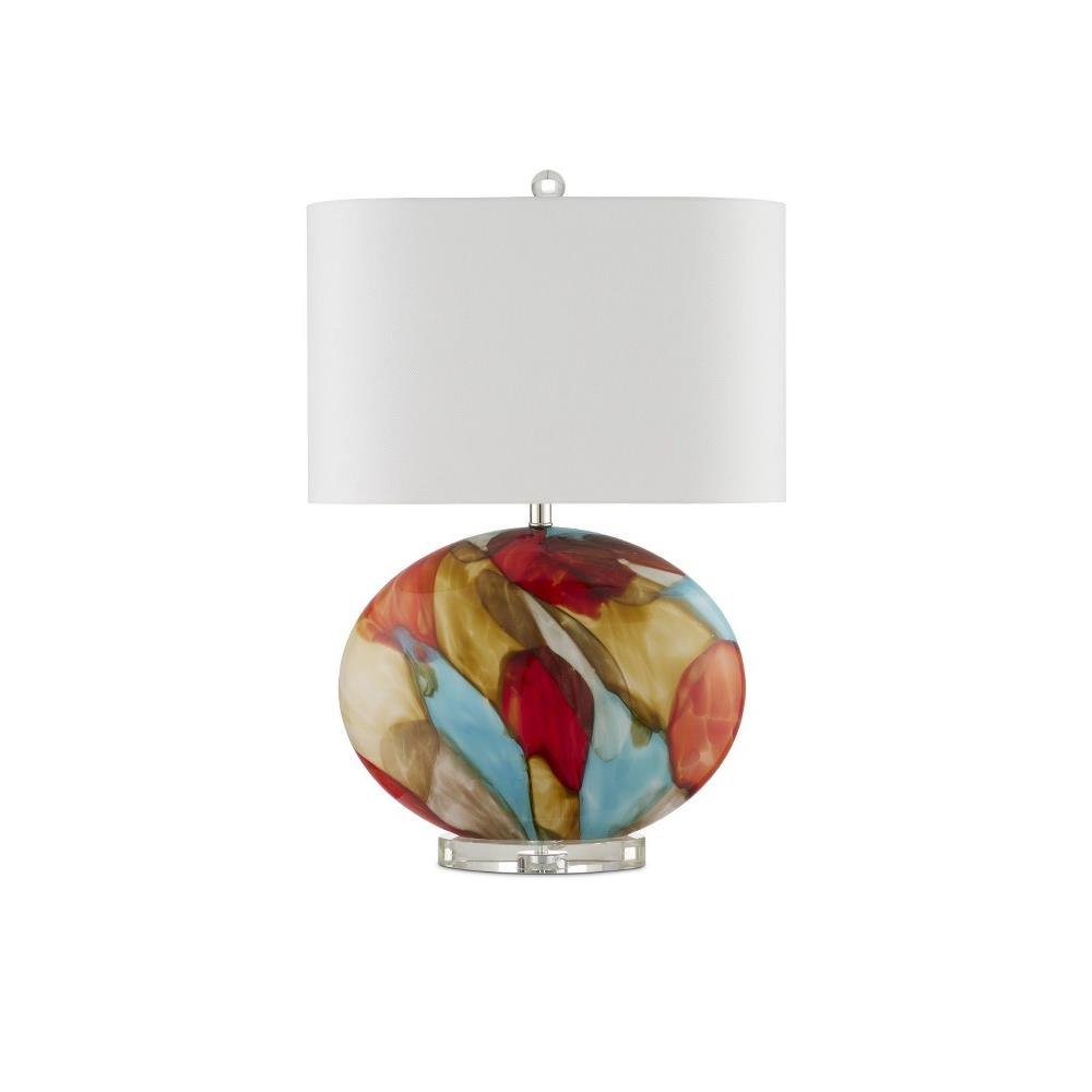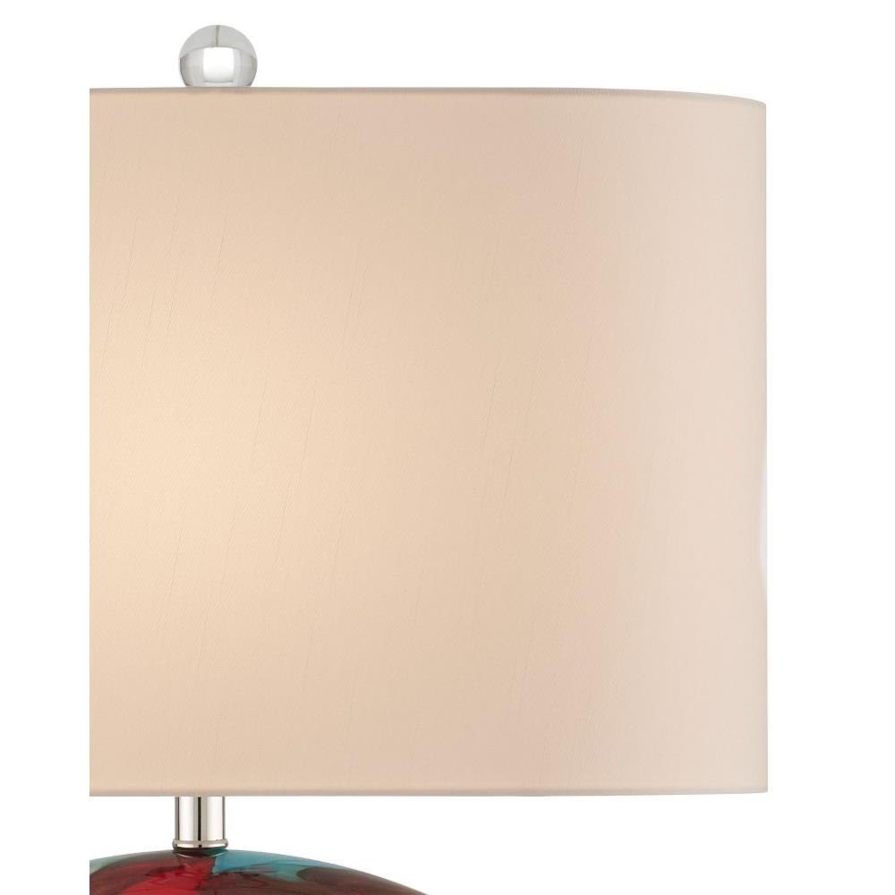 The Vivid Table Lamp lives up to its name with its swirling swaths of bright colors painted on its lozenge-shaped body. The multi-colored lamp glows even before it is fitted with an optic crystal base and finial, and polished nickel hardware. A polished design detail is how the shade is elongated in the same scale as the body and has rounded corners. The narrowness makes the lamp perfect for a spot where a fixture needs to sit close to the wall to free up tabletop space.