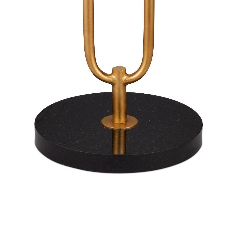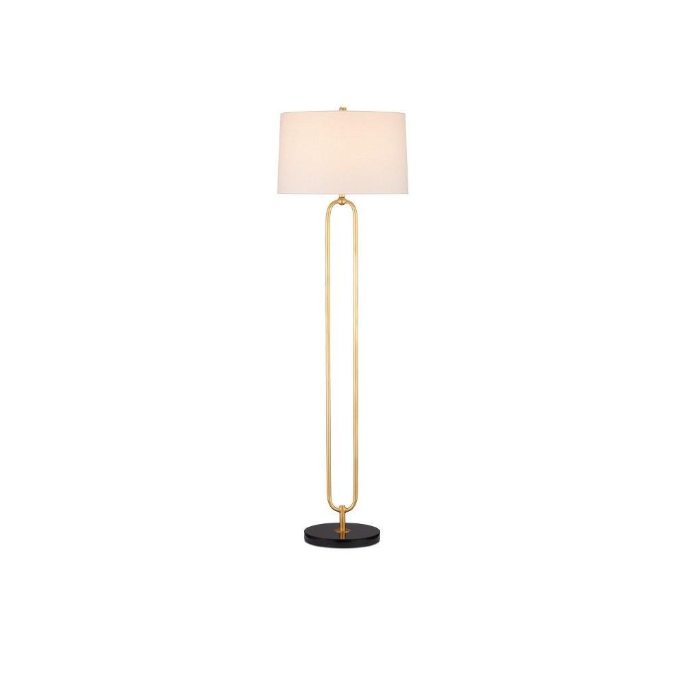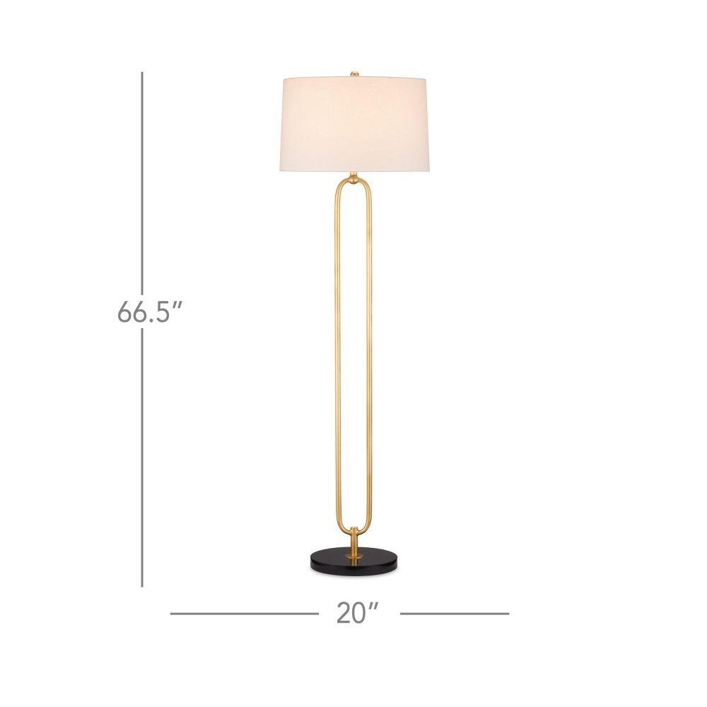 The oblong open-form body of the Glossary Floor Lamp is made of metal in a contemporary gold leaf finish. Clarence Mallari designed the gold floor lamp to look like a giant paper clip that rises above a black marble base. This contemporary design will be a perfect choice for a space needing stylish yet unobtrusive elements. The Glossary is topped with an off-white linen shade.