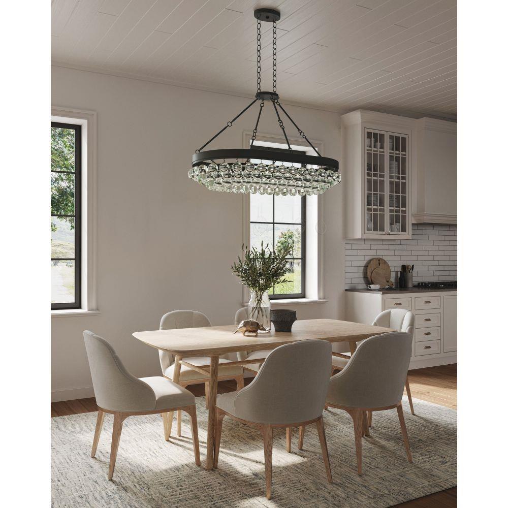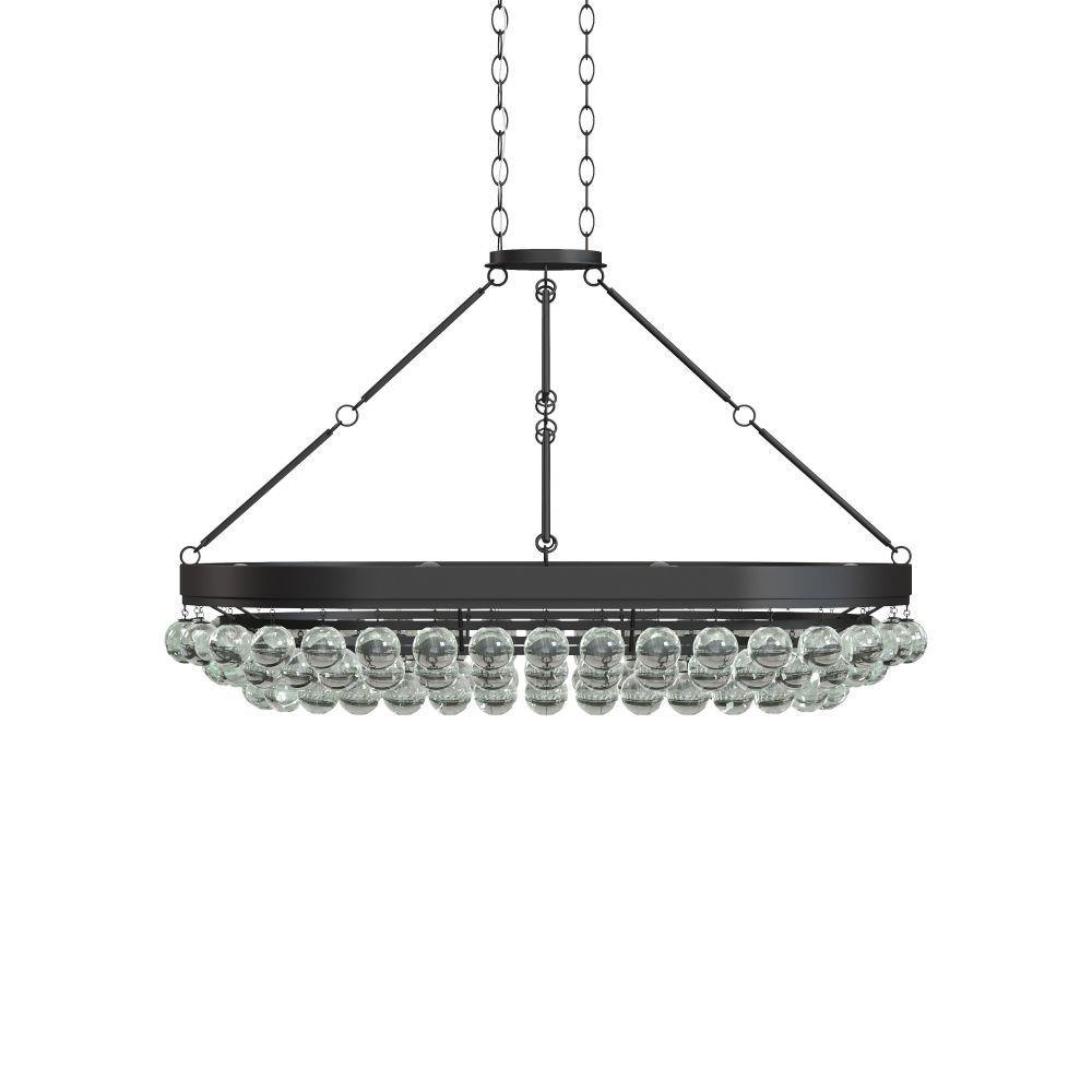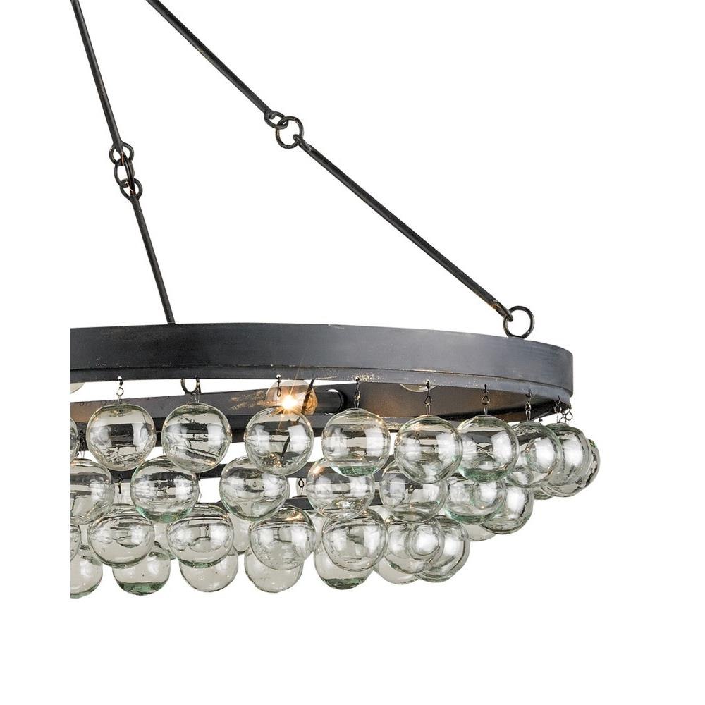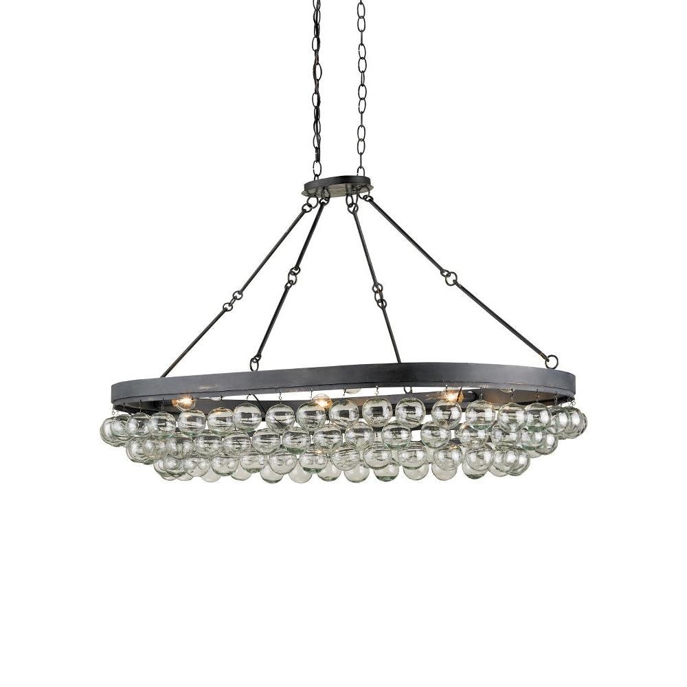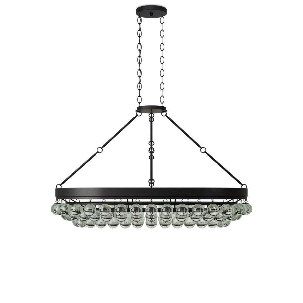 Blown glass spheres bubble beneath a robust wrought-iron oval to create a commanding profile in the Balthazar Oval Chandelier. It owes its handsomeness to its French black finish with its deep tones that contrast the glass elements on this black chandelier. We also offer the Balthazar in a pendant.