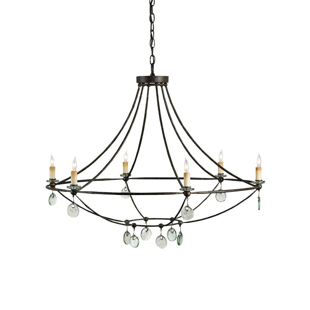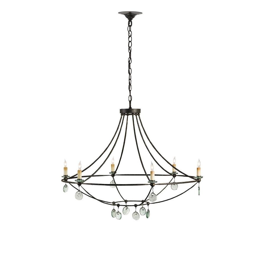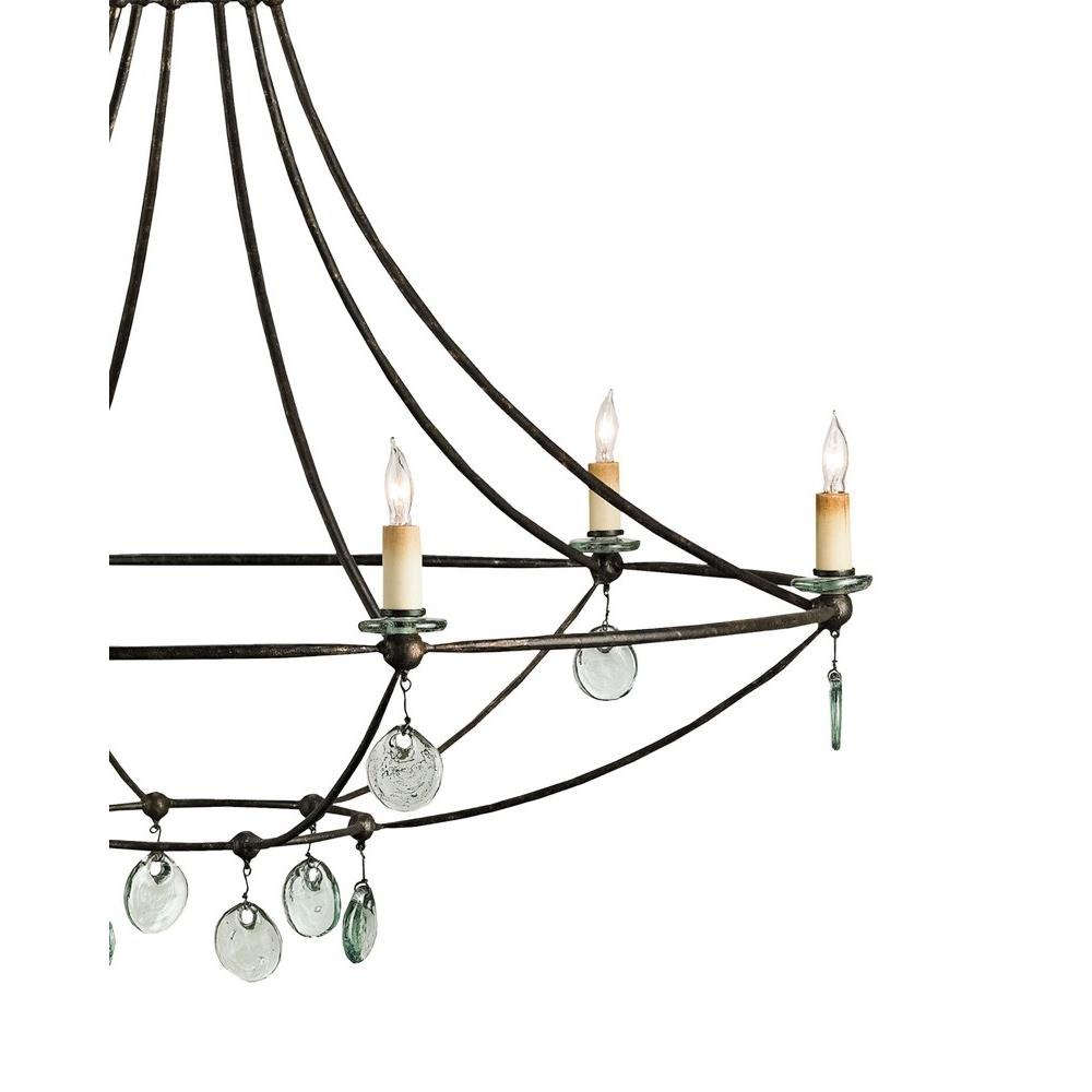 The Novella Chandelier showcases timeless craftsmanship and a creative use of materials. Recycled glass, which takes on a sheen when light strikes it, was used to create the bobeches and disks that adorn the black chandelier. The wrought iron frame in a Mayfair finish has an anchoring effect.