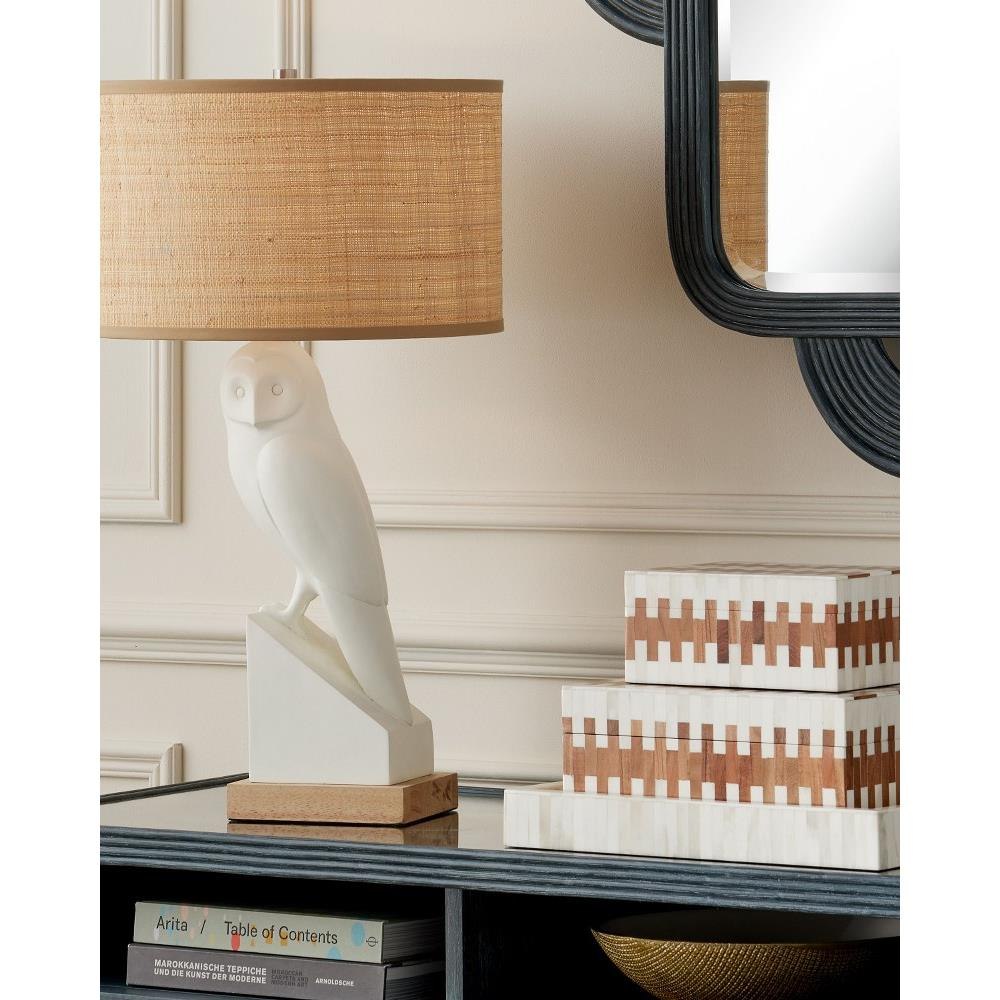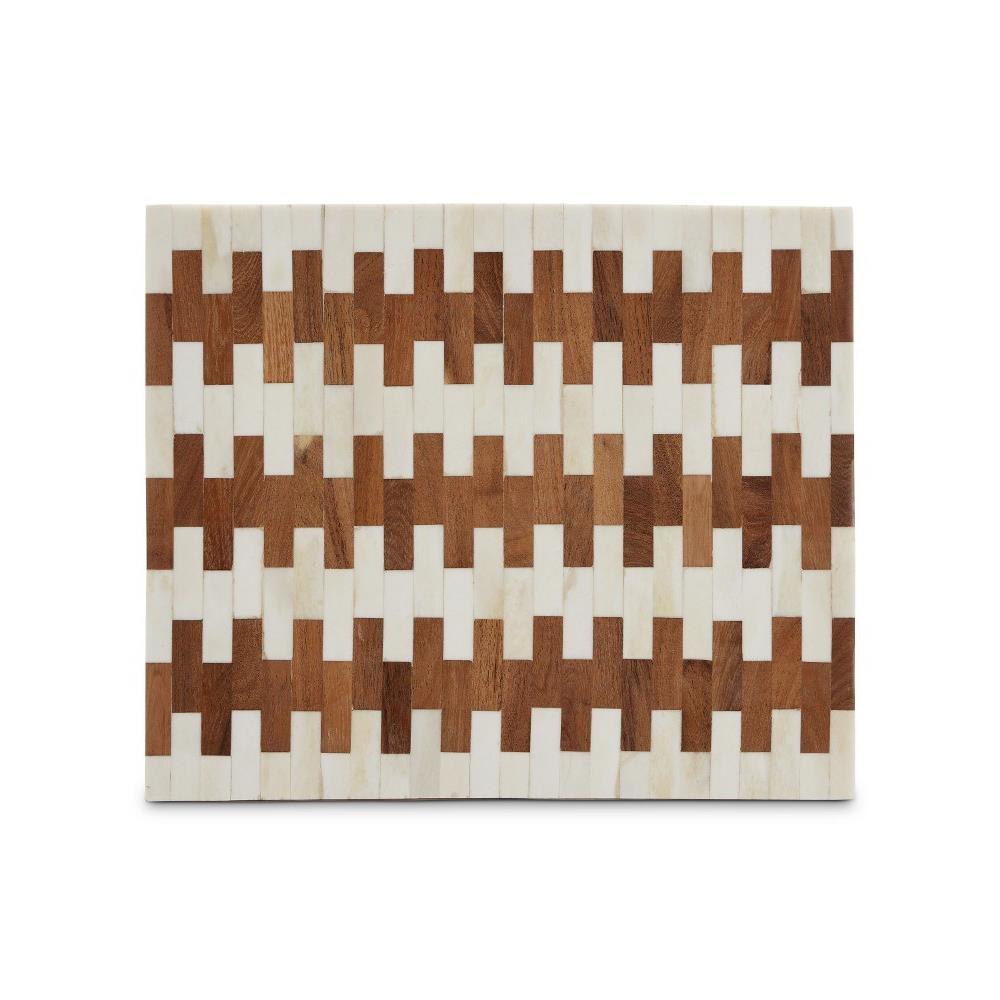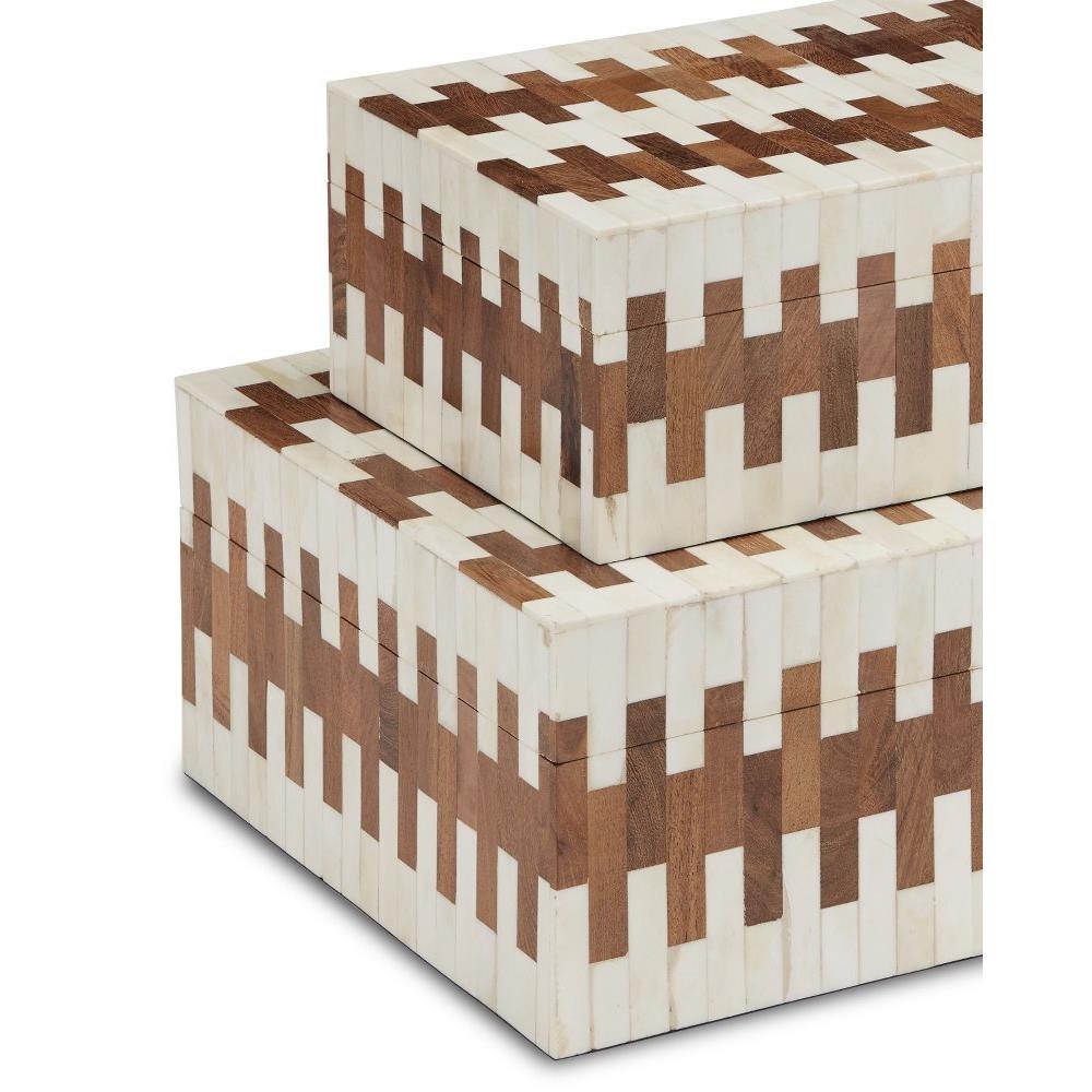 The Tia Box Set includes two decorative accessories in smaller and larger sizes. The offset brick pattern that runs along the sides and tops are made of white bone and wood to bring the brown decorative boxes a refined sense of movement that resembles piano keys. Both boxes are linen-lined and the designer Aimee Kurzner points out that there are brass pins on the inside that ensure the pattern stays aligned.