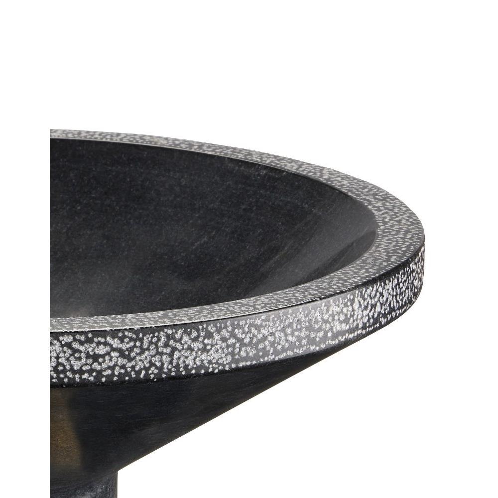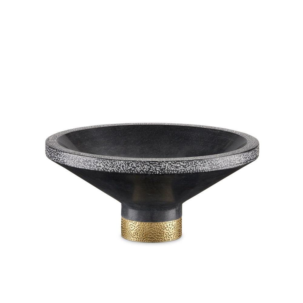 The Vincent Black Marble Bowl is made of solid marble with a brass-claded base and chiseled details on the edges, which bring it added texture. The base also has a stippled surface achieved when artisans chisel the surfaces. Because this black decorative bowl is made of a natural material, slight variations will exist from piece to piece.