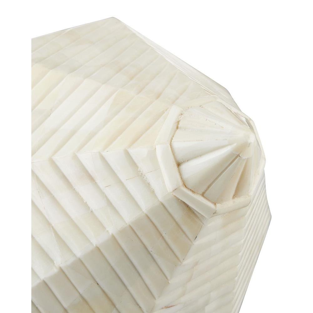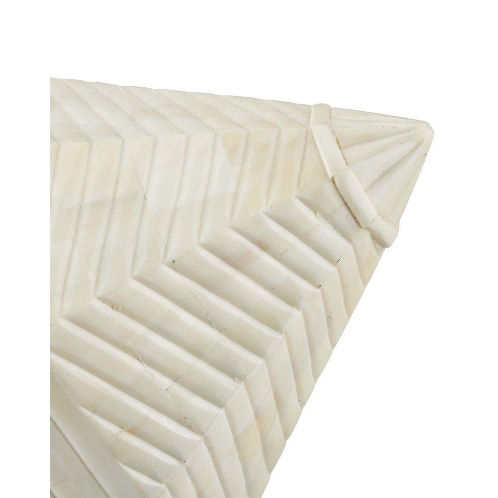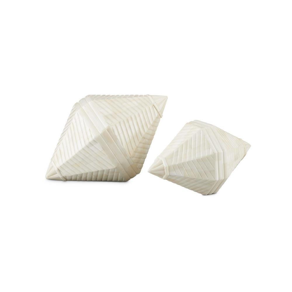 The Pavi Bone Prism Set includes two white sculptures that are the definition of artisanal, as they are handmade and covered in bone inlay. The painstaking process required to cover sculptures as organically shaped as these is quite a feat. The shell-shaped sculptures will stand out even if they become elements in a lively vignette.