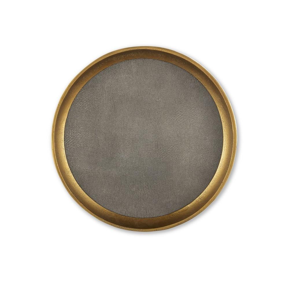 The Tanay Round Tray has an incredible mix of textures. First is the cast aluminum rim that has tell-tale pitting on its gleaming antique brass surface. Adding even more dynamism is the bottom of its interior that is stamped in a graphite snakeskin pattern. This masterpiece of artistry will be a scene-stealer when used to carry cocktails or appetizers.