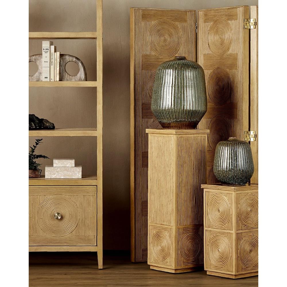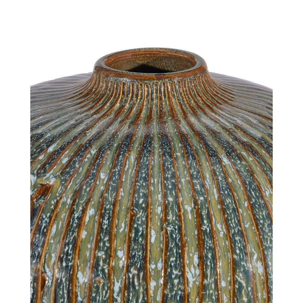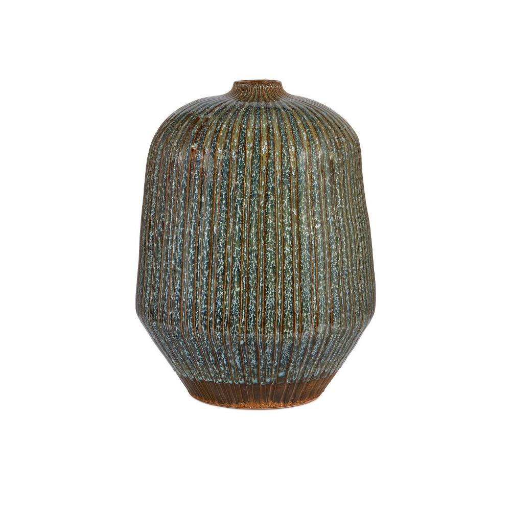 The Shoulder Large Vase is made of ceramic that is hand-thrown by Thai ceramicists, then intricately decorated with green and brown reactive glazes. This brings the surface of the large vessel some serious texture. The liveliness of the surface will also add a Bohemian vibe to the space it will ornament. Because the glazes are applied by hand, this piece will vary slightly from vase to vase.