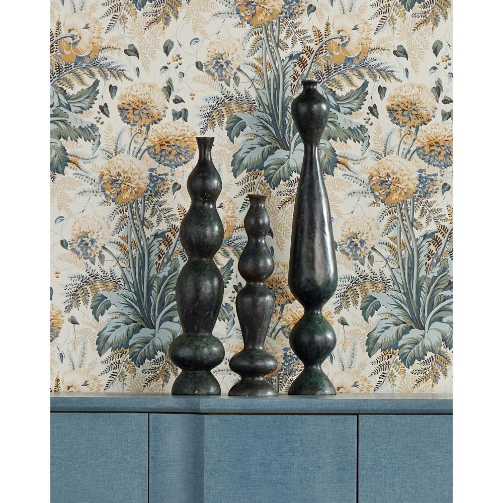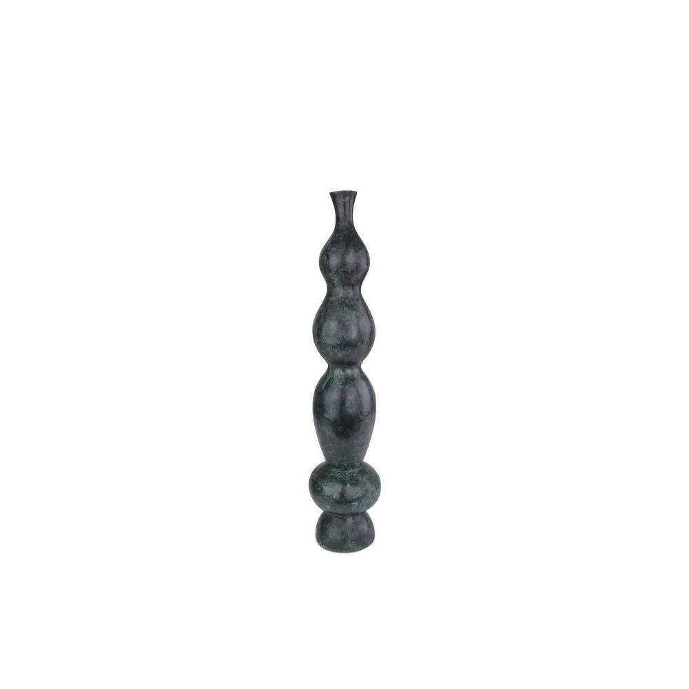 The Luganzo Medium Bronze Vase has the undulant character of turned wood, but the sculpture is made of bronze with a jade green patina. A polished gold ring defines the culmination of its neck for a hint of sheen. The incredible distressing the artisans achieved with this vase after it has emerged during a lost-wax technique makes it a stunning textural piece that will read like an antique.
