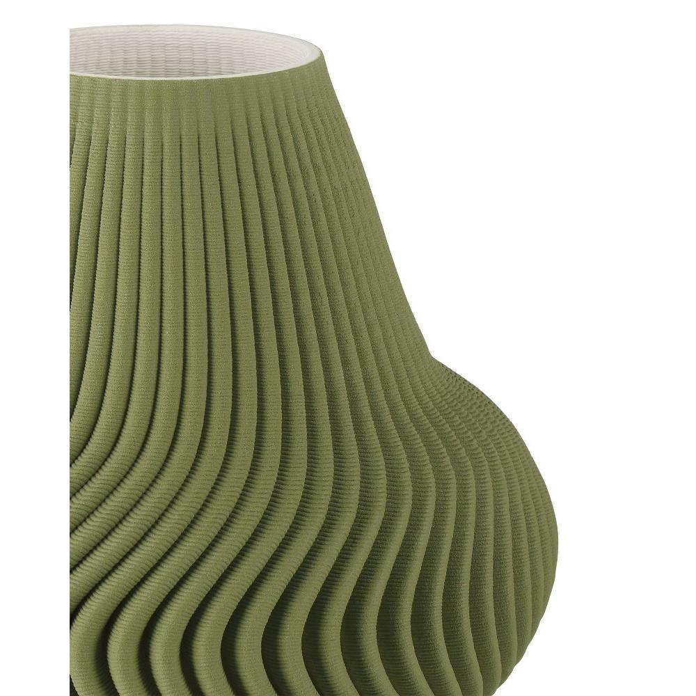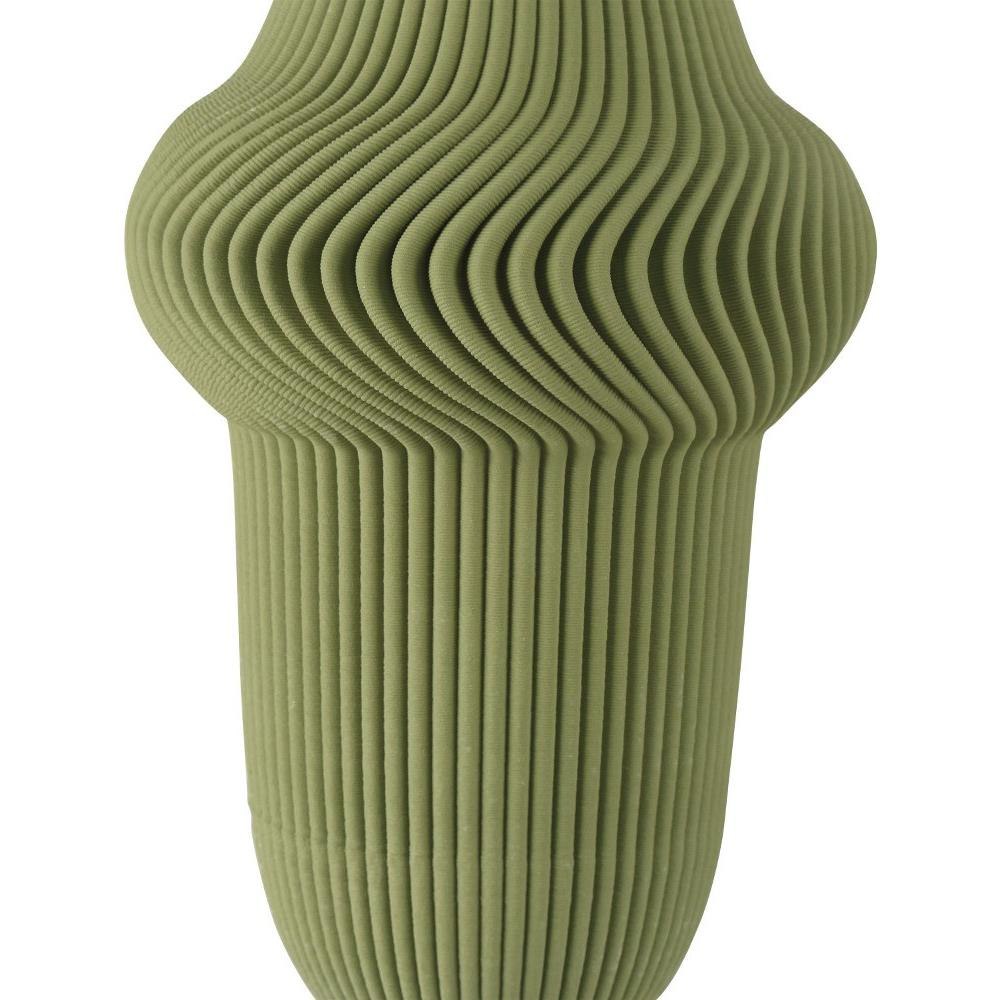 The Green Plisse Medium Vase is attractive in a lovely hue of olive green. The deep furrows that that swirl around the bulge in its form tighten and straighten as they flow to the top and to the bottom in a uniformity that can only be machine-made. The most surprising thing about this handsome vessel is that it is made of 3D-printed porcelain, an ancient material you might not expect to be so amenable to such a contemporary process.