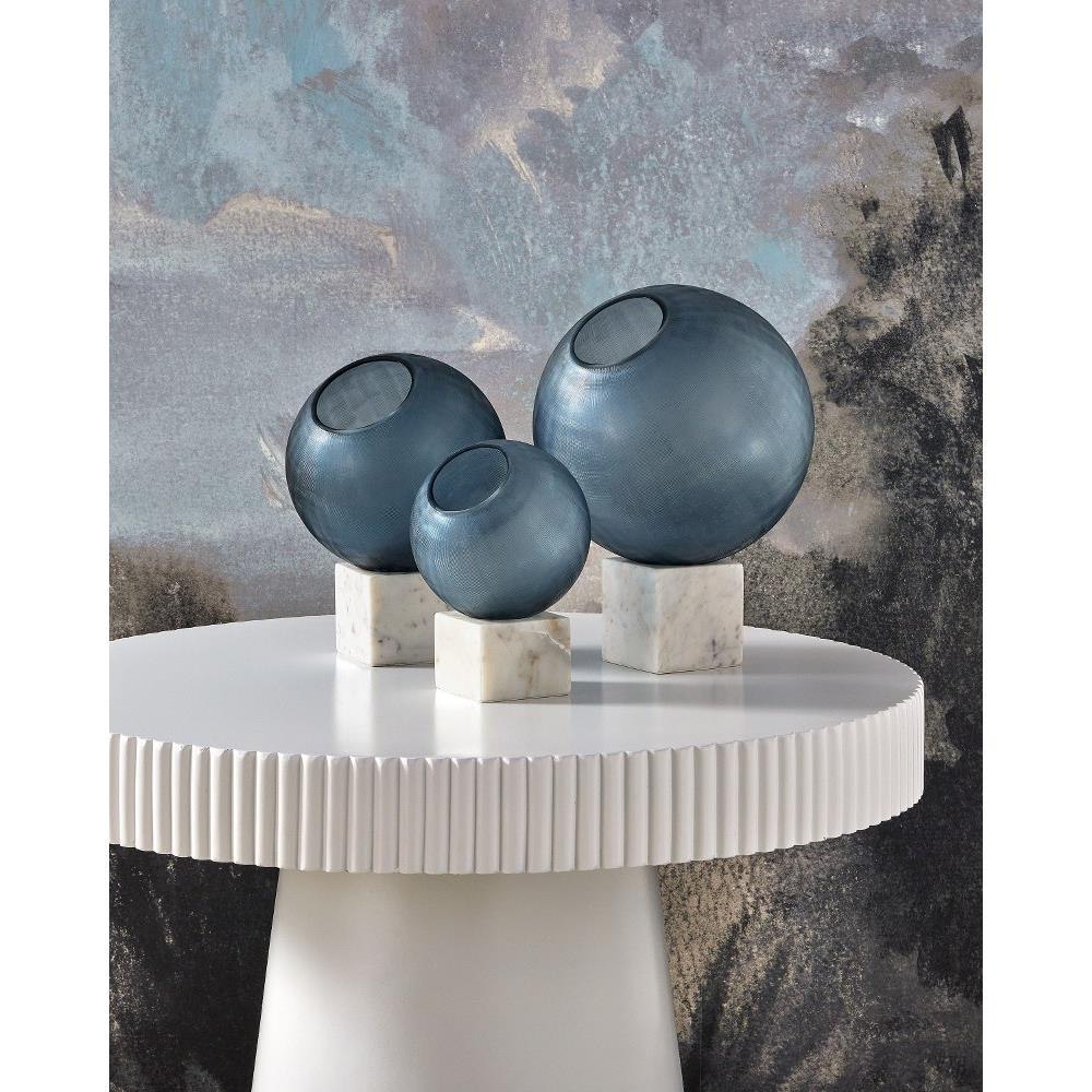 The Fresno Blue Orb Set includes three blue sculptures made of bubbly glass that glow when touched by natural light. The artisanal quality of the glass makes these white and indigo blue accessories sophisticated elements in an interior. Each orb sits atop a white marble block so it is easy to position them perfectly. As a group, they create a sophisticated display.