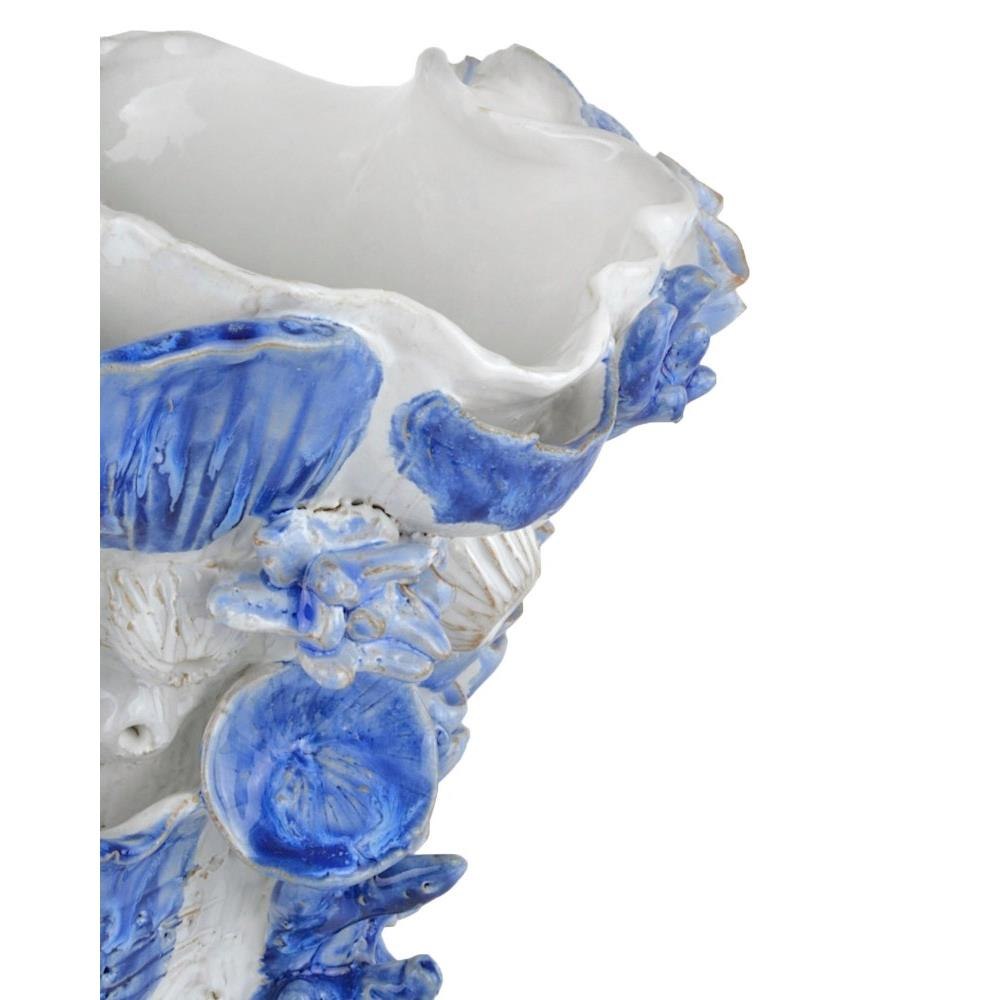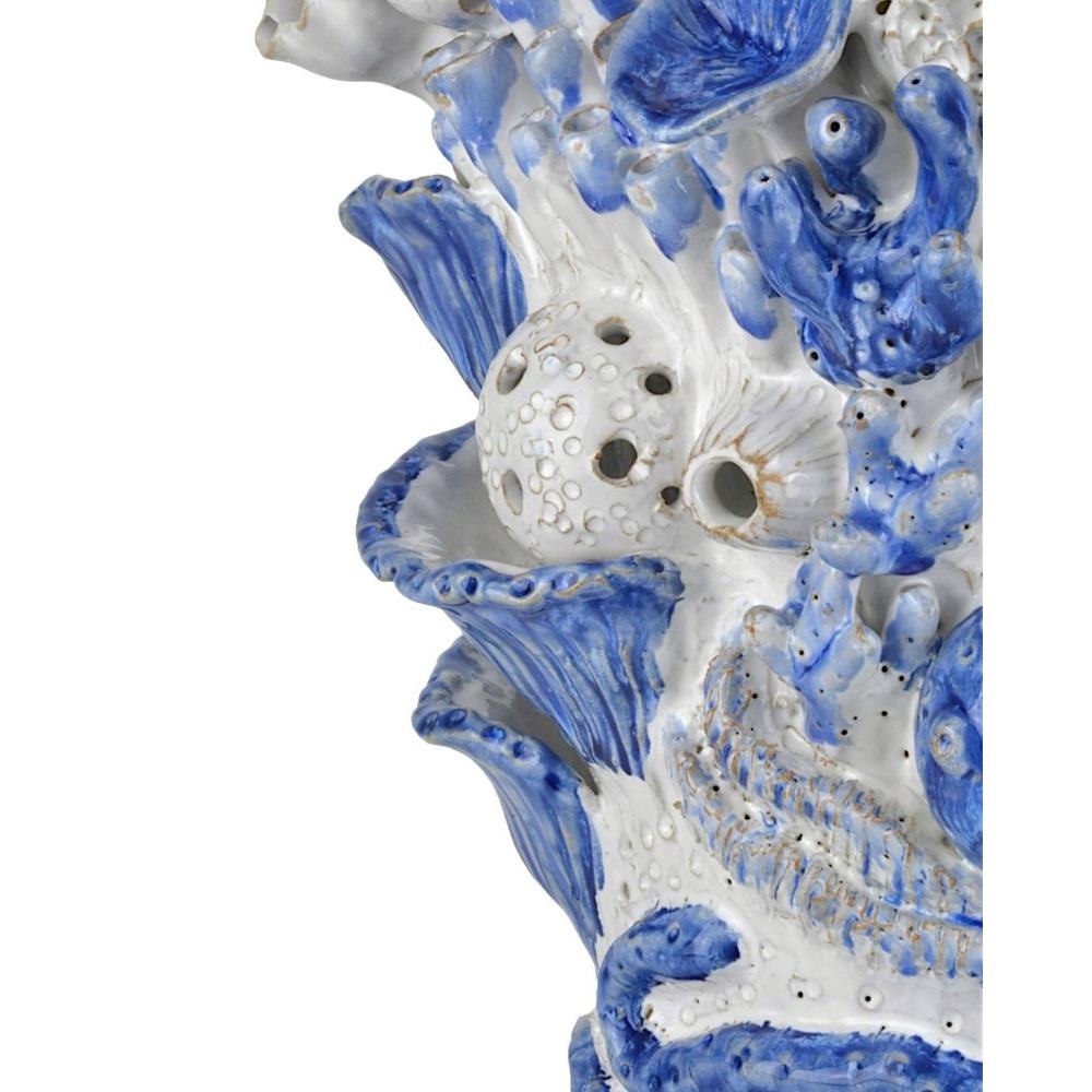 The Coral Reef Large Vase is made of ceramic glazed in a mix of white and reactive blue. The sea creatures affixed to the sides of the white and blue vase are painstakingly fashioned and applied by hand by a group of women artisans who live at the border of Burma and Thailand.