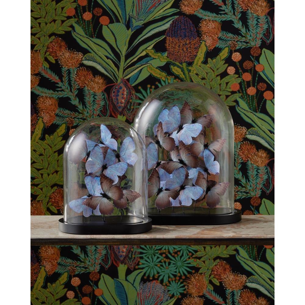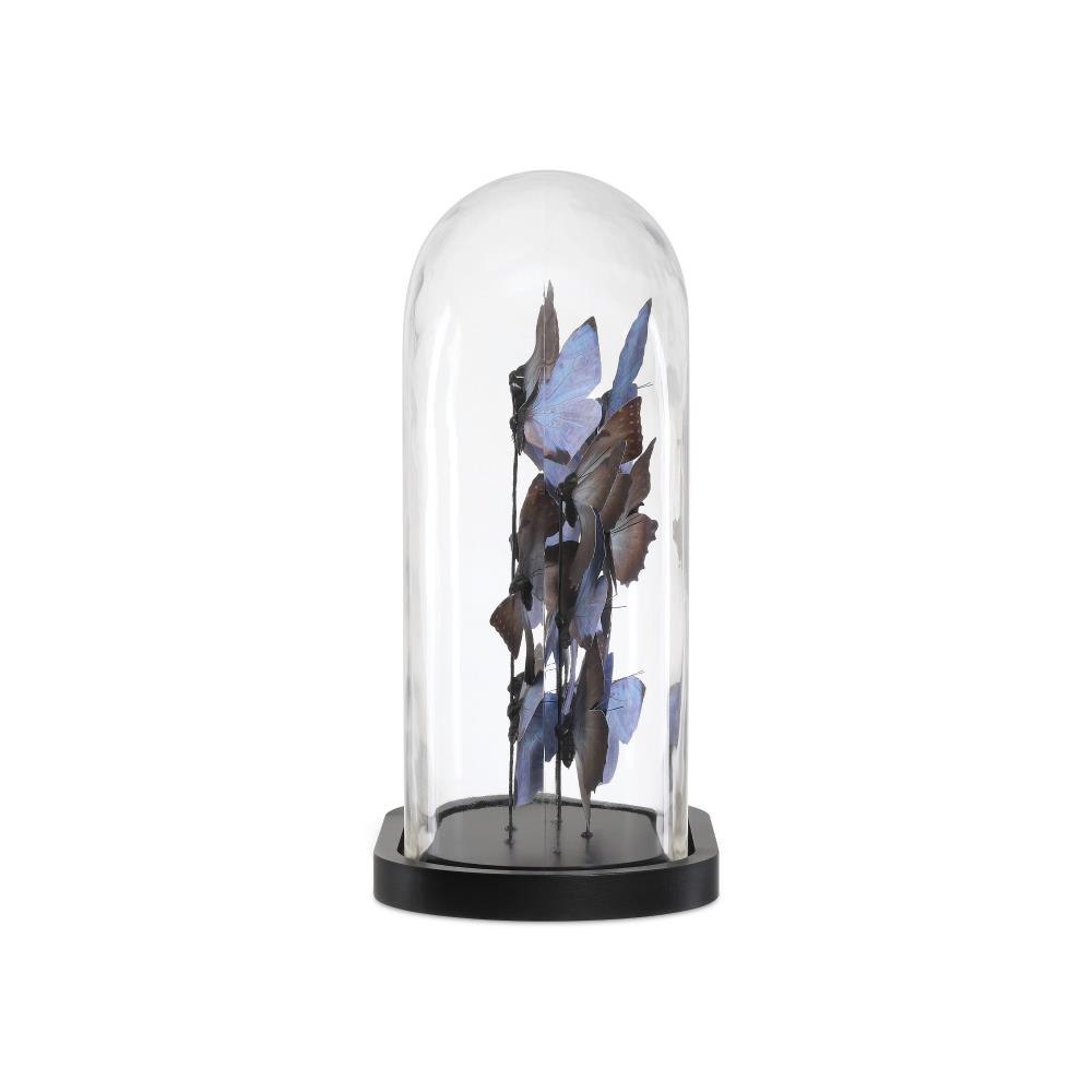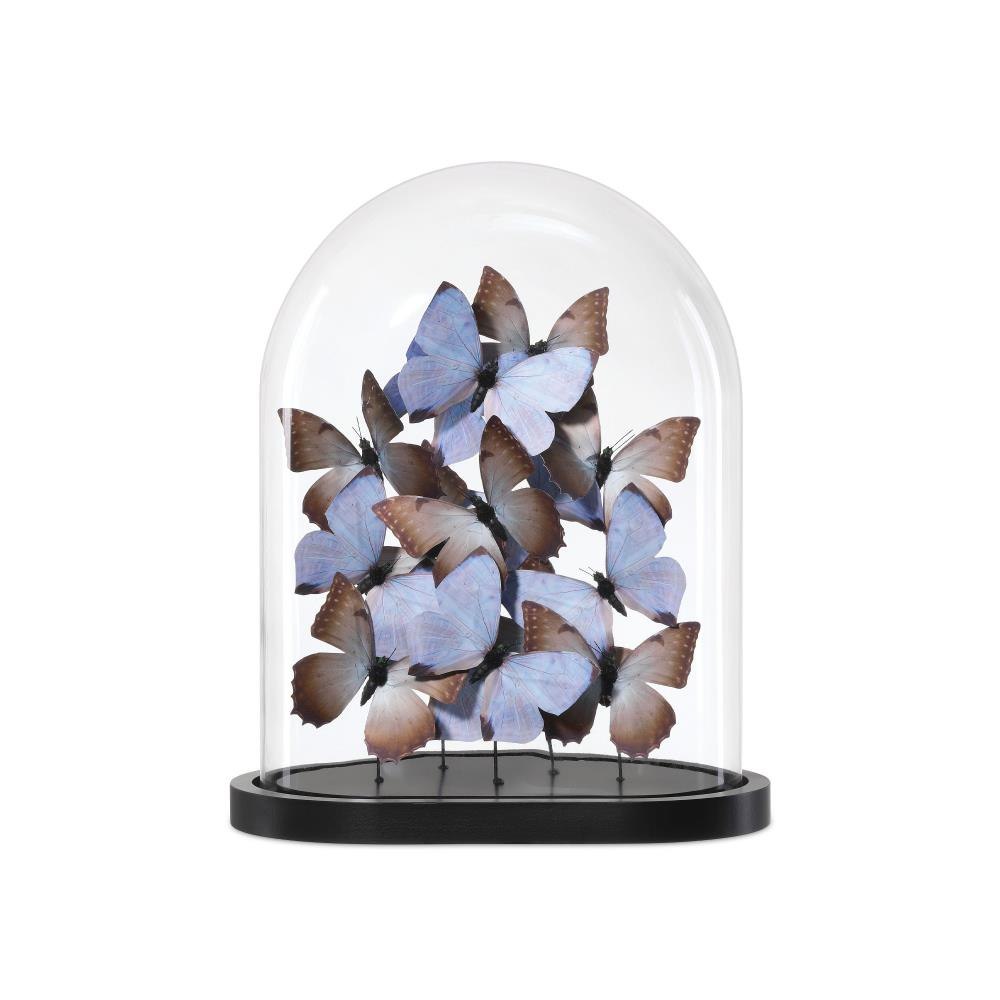 The enchanting Rue de Bac Pale Blue & Pink Large Butterflies are crafted from forging paper, each butterfly meticulously shaped and arranged to appear as though it's gracefully fluttering within a glass dome. Soft pale blue and blush pink tones add a dreamy quality to the composition that is set atop a sleek black oval base to provide a modern contrast to the airy, nature-inspired design.