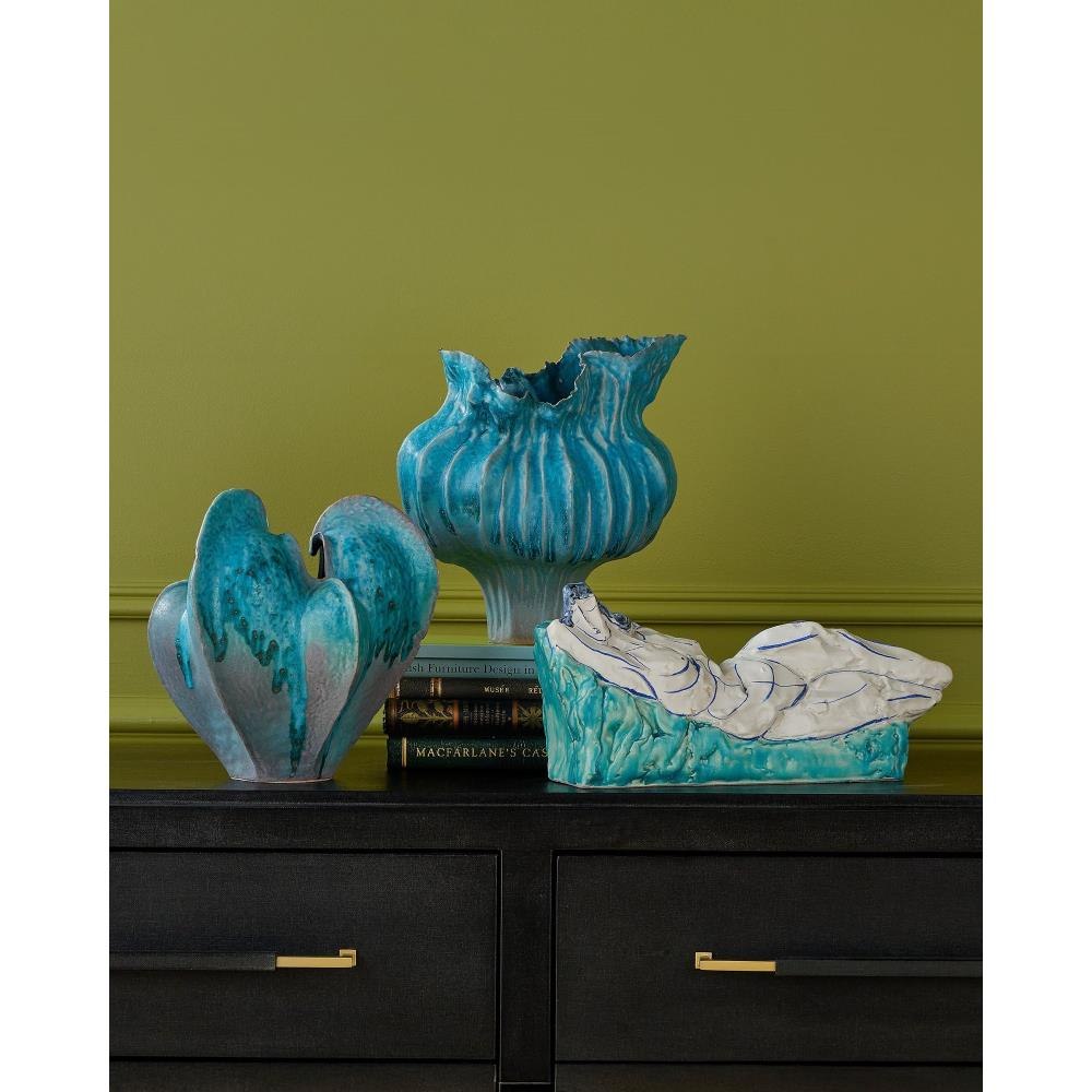 The striking Flying Silk Blue Vase is expertly crafted from porcelain with a graceful free-form silhouette—a true testament to the complexity and skill required to achieve such fluidity in ceramic design. A slender base supports a seed-pod-inspired shape over which a cascading turquoise glaze has been applied to drip organically down the form, adding a sense of movement and depth.