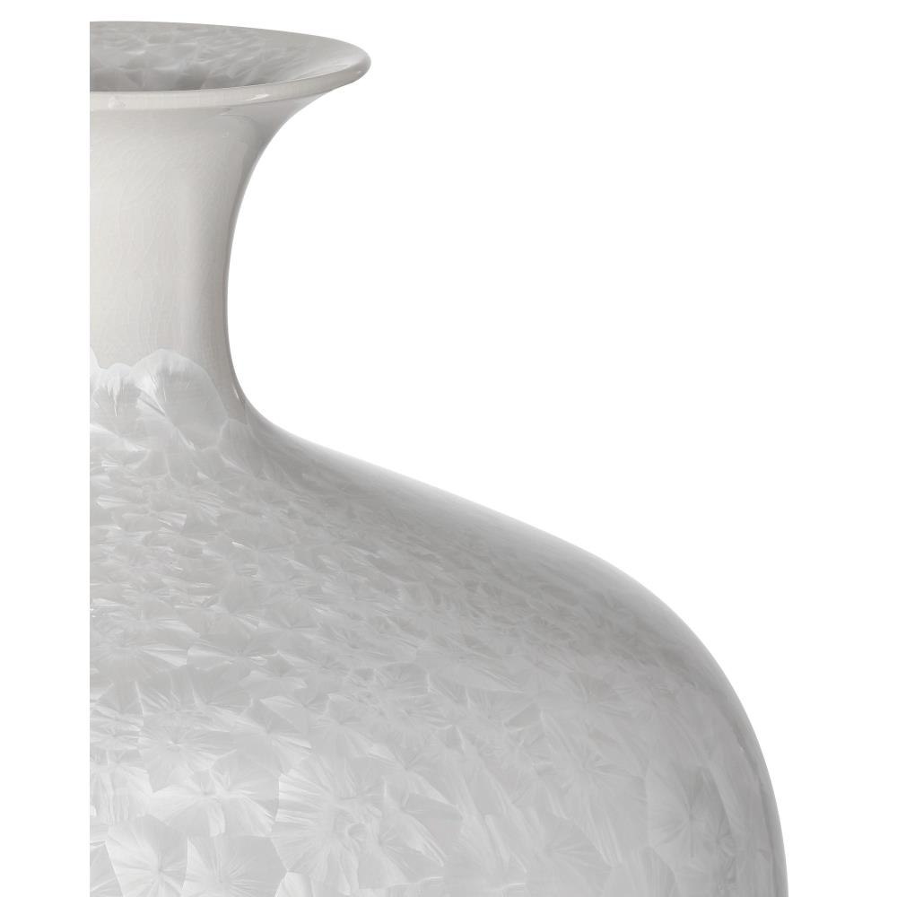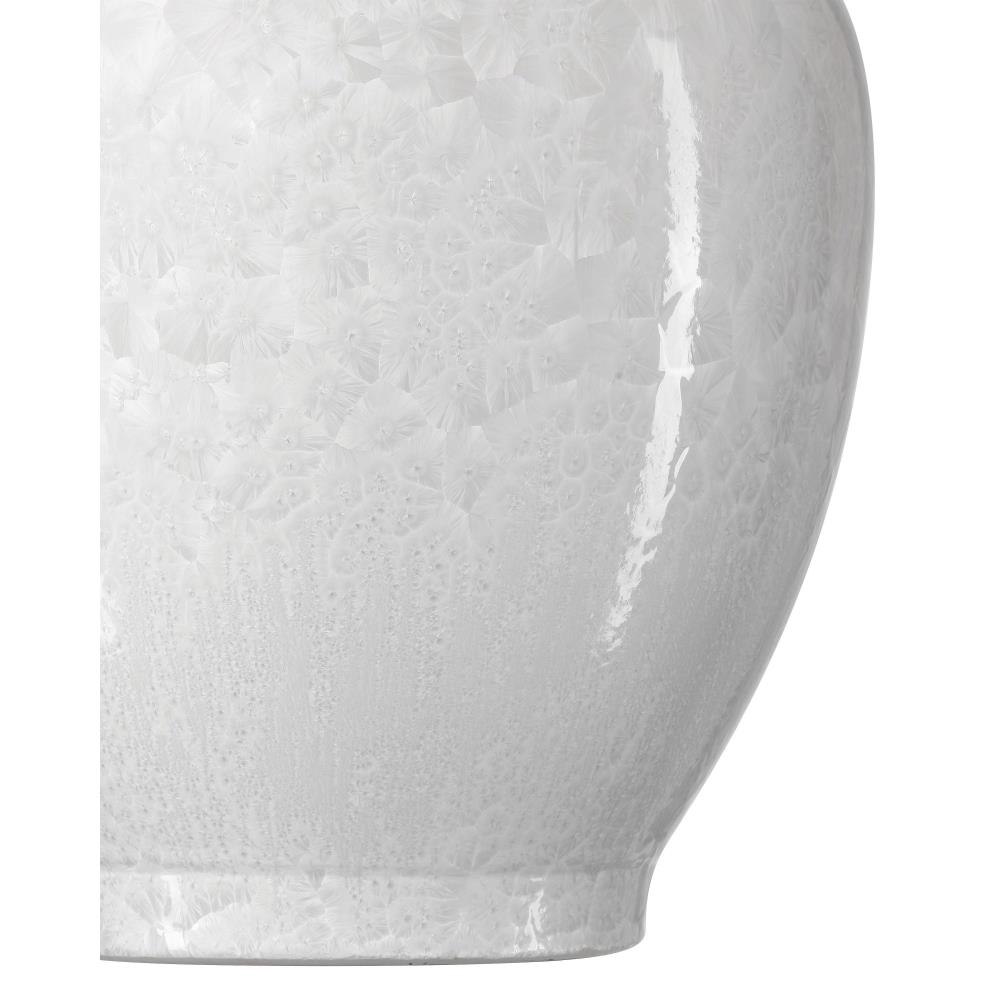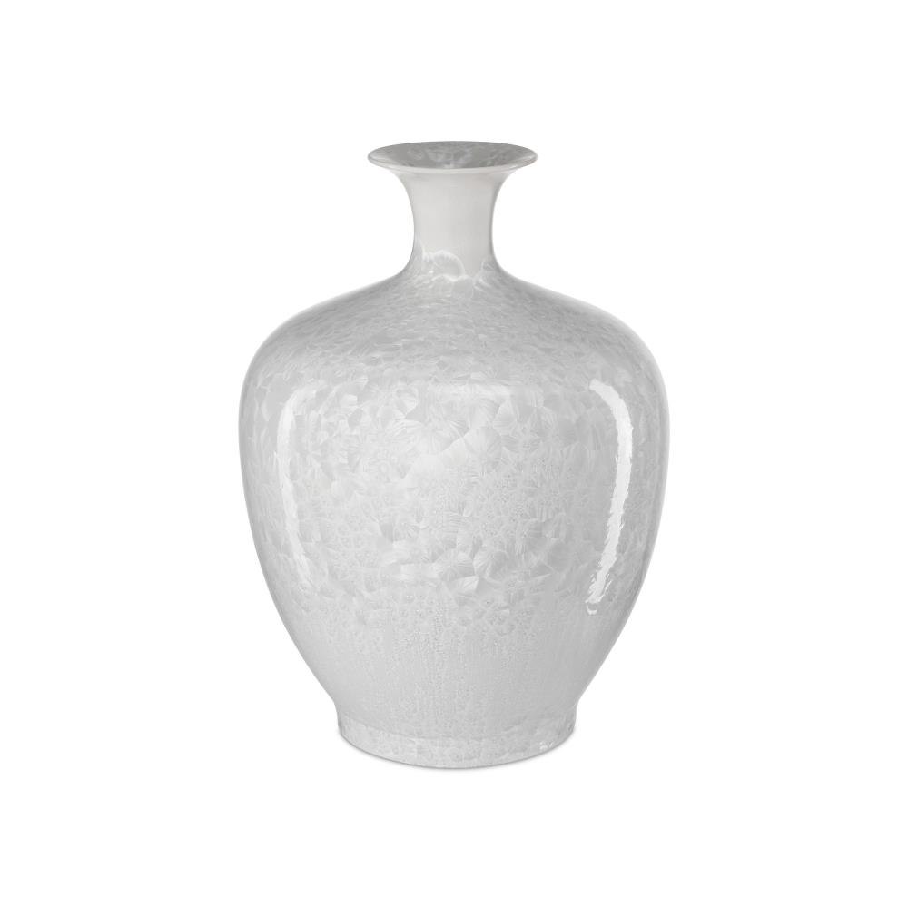 The ethereal beauty of the Crystalline White Vase results when mouthblown porcelain is adorned with delicate crystalline bursts on its surface. These organic formations vary in placement and abundance, creating a luminous mother-of-pearl effect that shimmers softly in the light. Each vase will vary slightly due to the natural placement of the crystalline bursts, making it as unique as it is elegant.