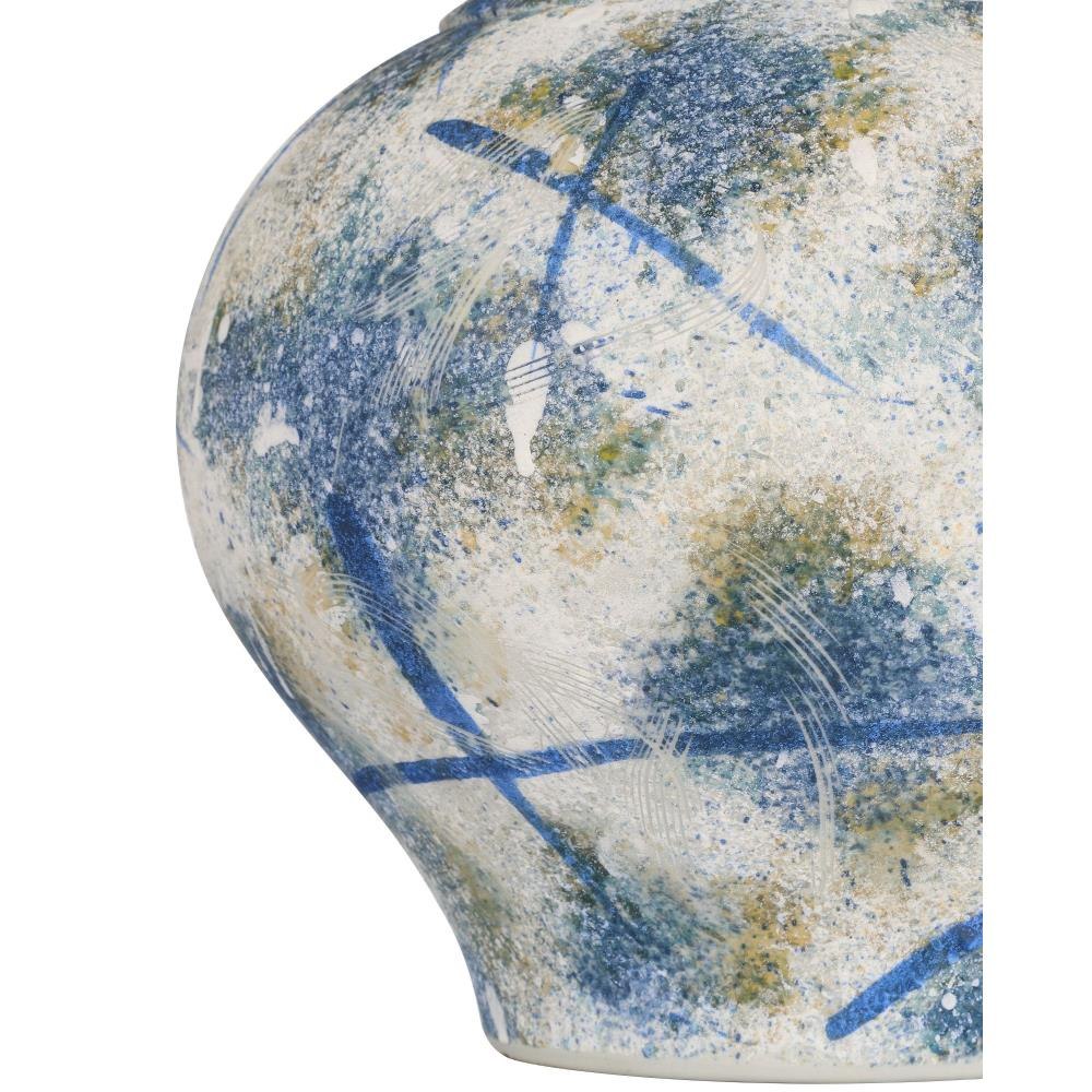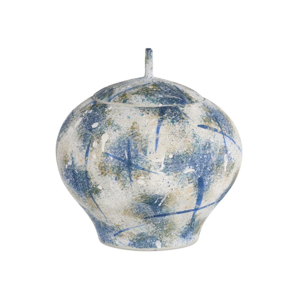 The Jackson Blue and White Vase is crafted from porcelain in a lidded jar-shape that pays homage to traditional design with a bold, contemporary edge. Finished in antique blue and off-white, the surface features a dynamic splatter-painted glaze, enhanced with hand-applied sponging and carved indentations that add texture and depth. These modern texturizing techniques make every piece unique as they are hand-applied.