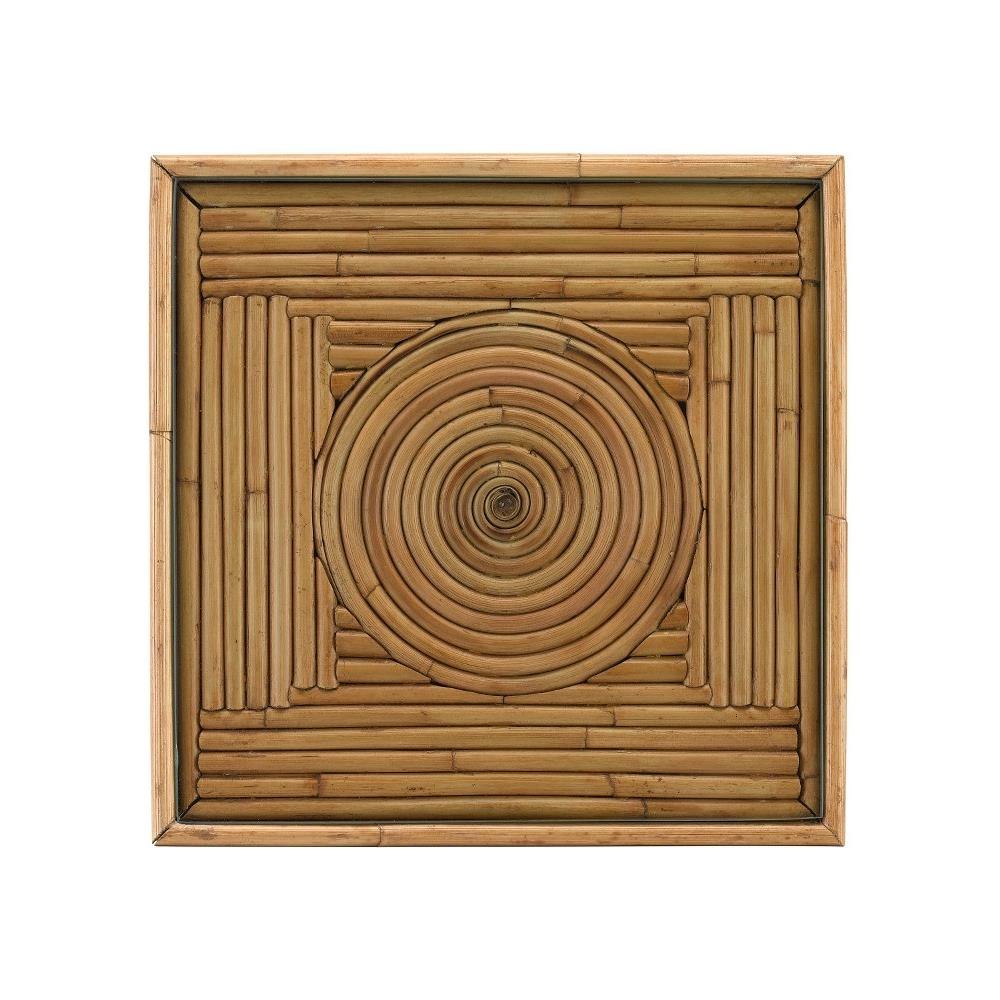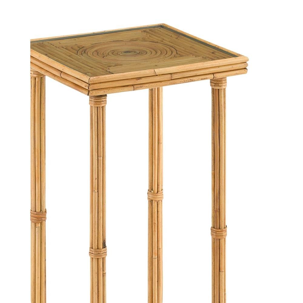 Our Silang Drinks Table is a petite rattan drinks table with a hand-made geometric pattern on the top. Artisans painstakingly cut and fit the reeds in place to create this artful arrangement in the plant's warm hues. The material is protected by an inset glass top.
