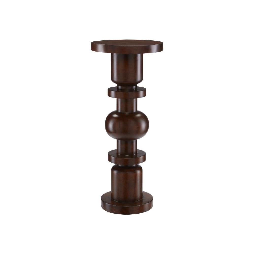 The Sasha Walnut Drinks Table is made of mahogany in a dark walnut finish. A juxtaposition of geometric shapes makes this occasional table a trickster: is it a chess piece or could it be a part from some exotic engine?