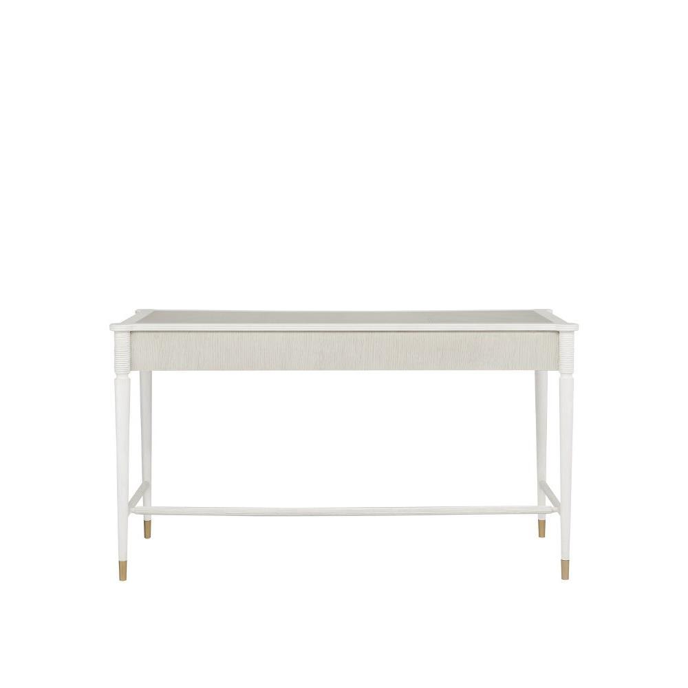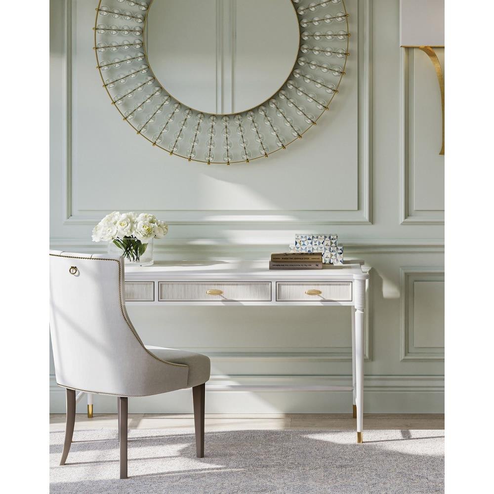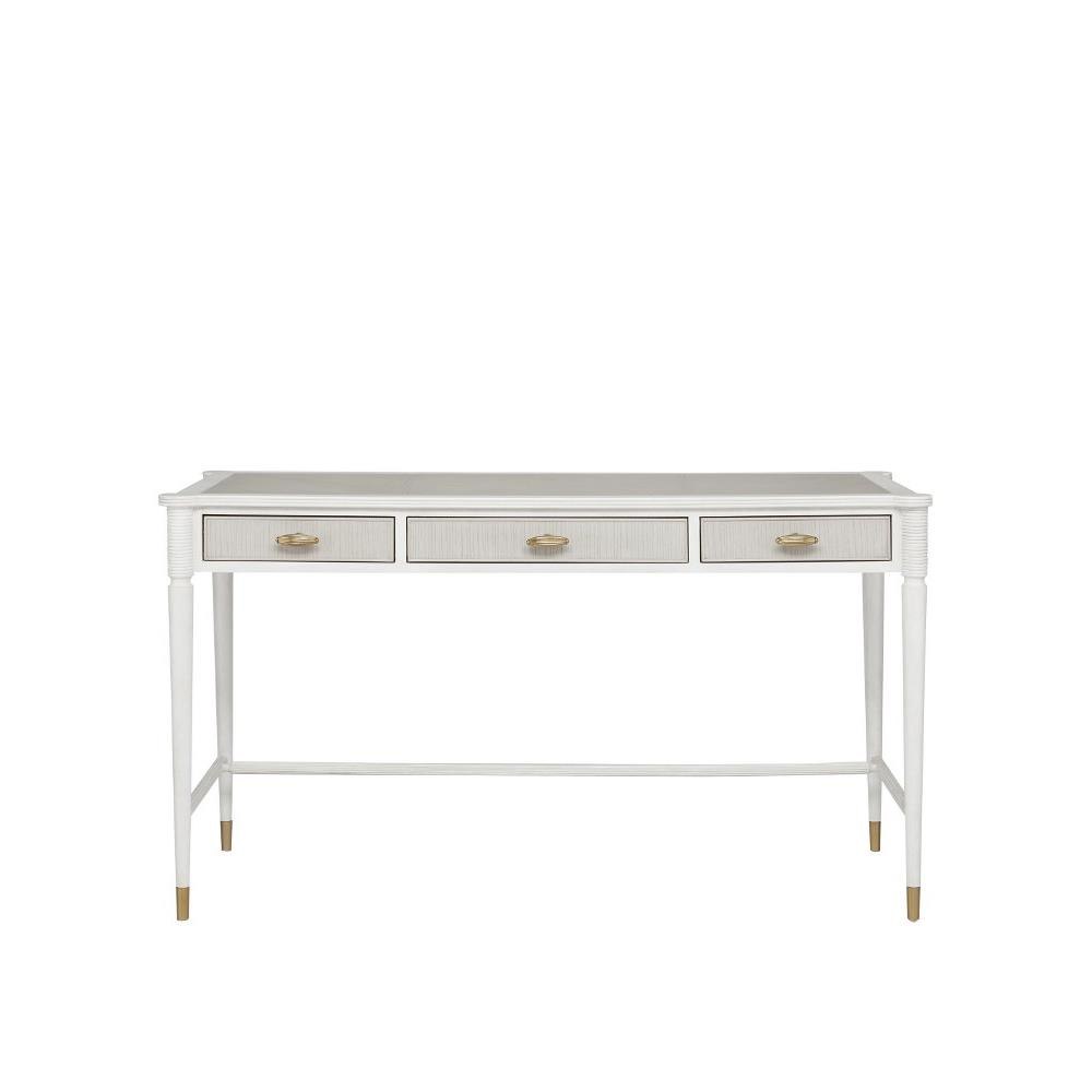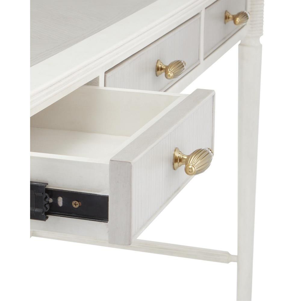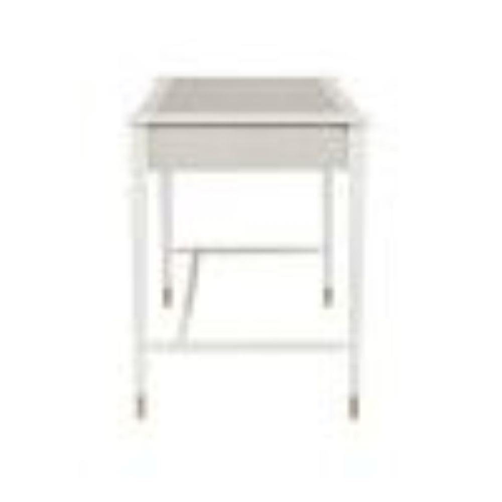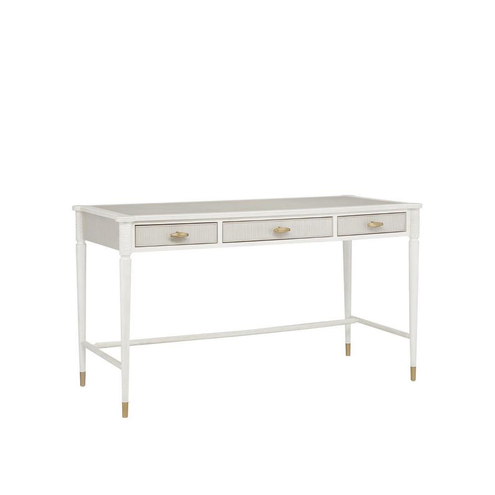 Made of mahogany and oak in a mix of off white and fog finishes, the Aster White Desk was inspired by an antique from the Winterthur Museum. The gray and white desk has three drawers on which the brass pulls are warm accents in a brass finish.