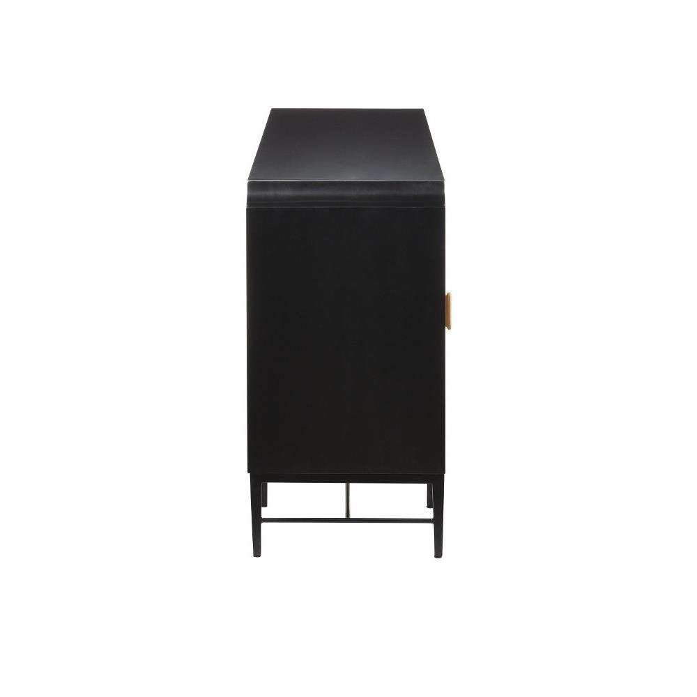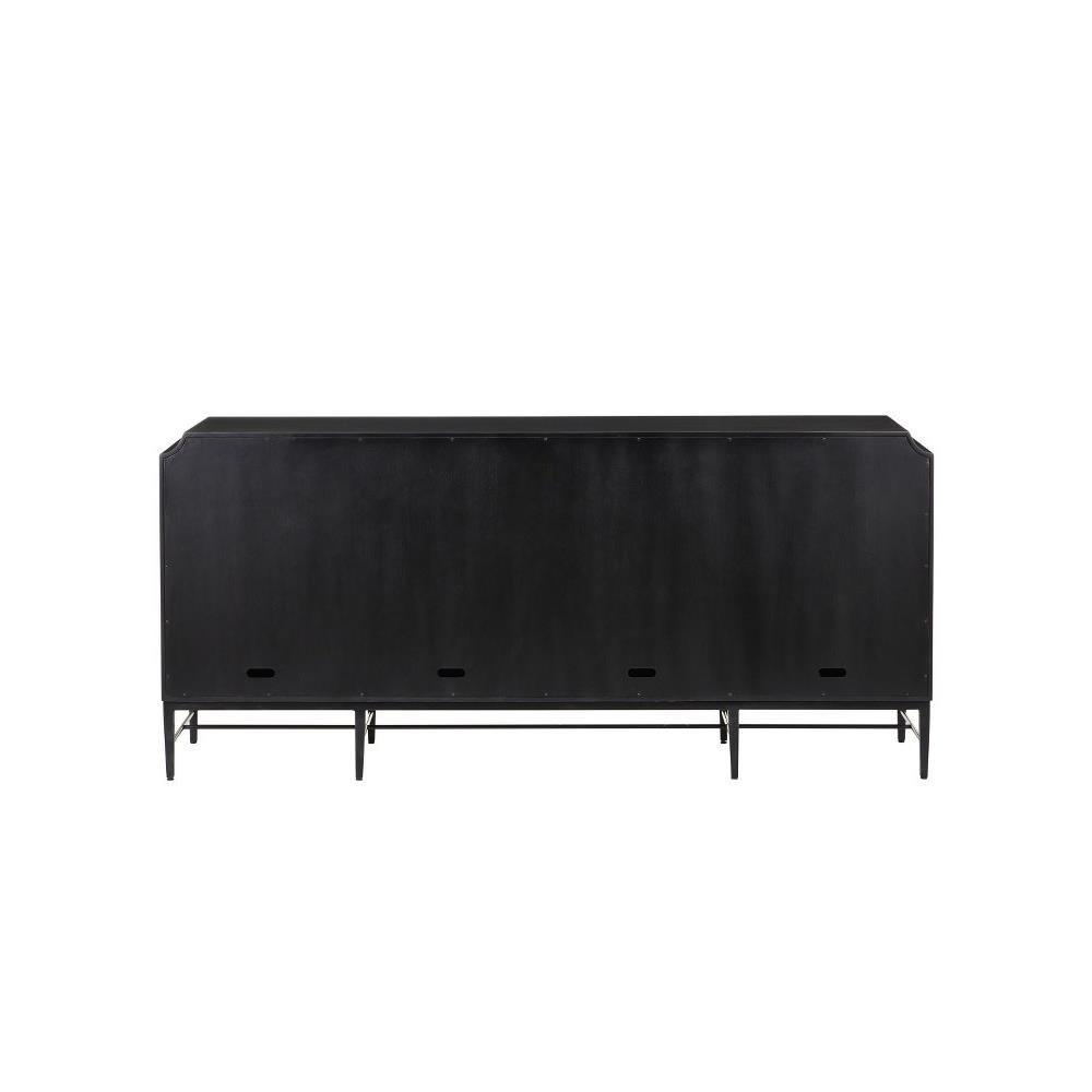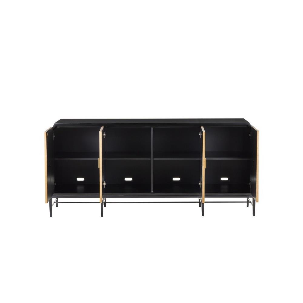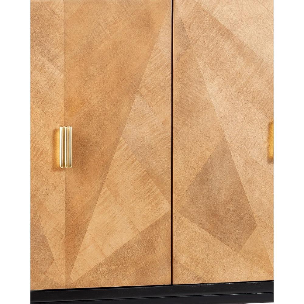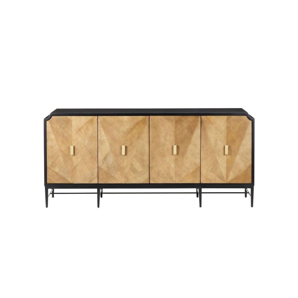 The Kallista Taupe Credenza has a taupe finish that enlivens the figured sycamore veneers on its door fronts. The wood grains bring the credenza a hint of distressing that contrasts the rich black of the cabinet's exterior. The door pulls are in a polished brass finish. Specialty treatments on this artful tan chest include soft-close doors and cord management openings.
