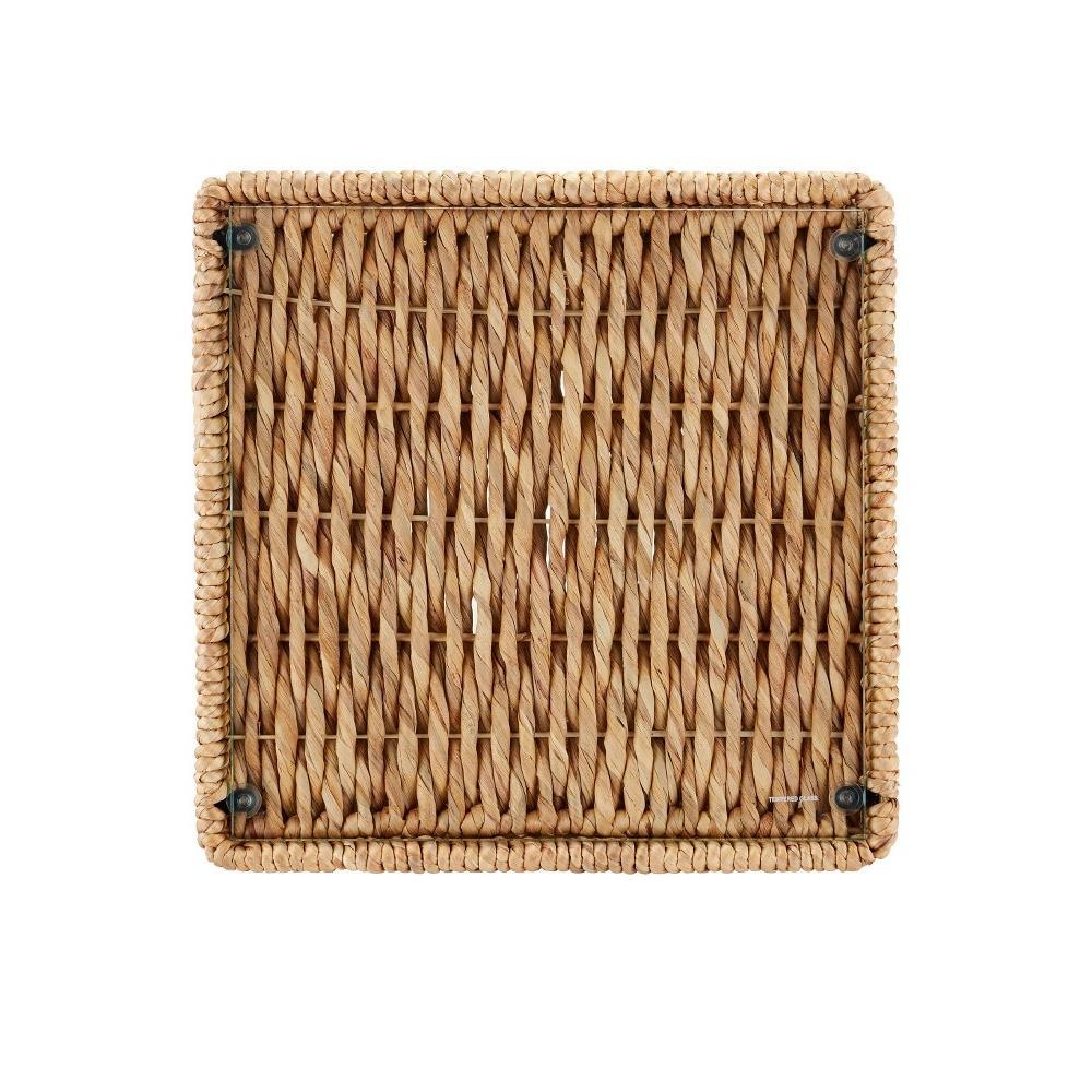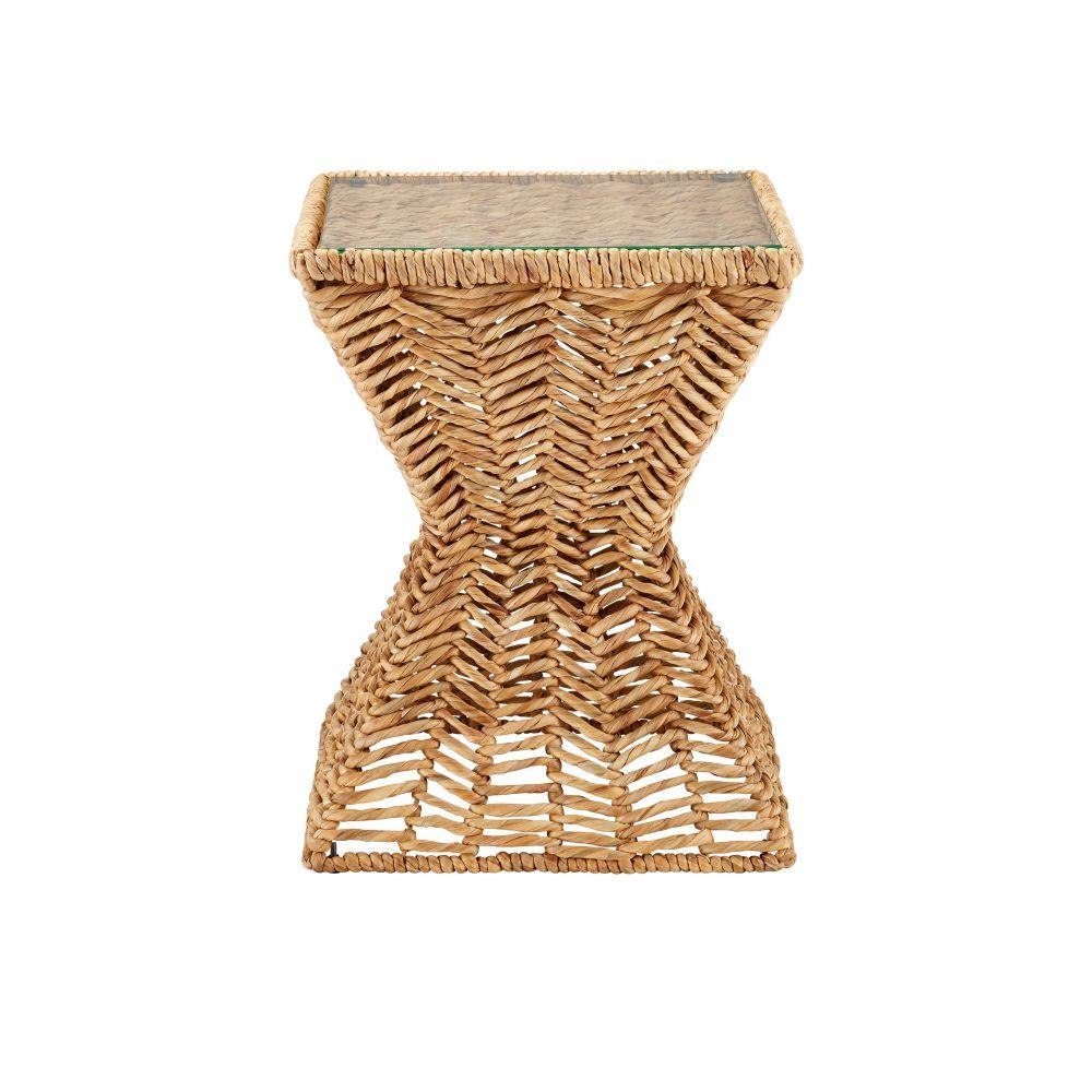 The Hadi Accent Table is a generously sized side table that fits squarely within a natural materials story, with beautiful water hyacinth rope that is wrapped around the metal frame in a sophisticated square hourglass shape. The dexterity required to create such a seamless weave makes this an artisanal creation. The inset top is made of tempered glass.