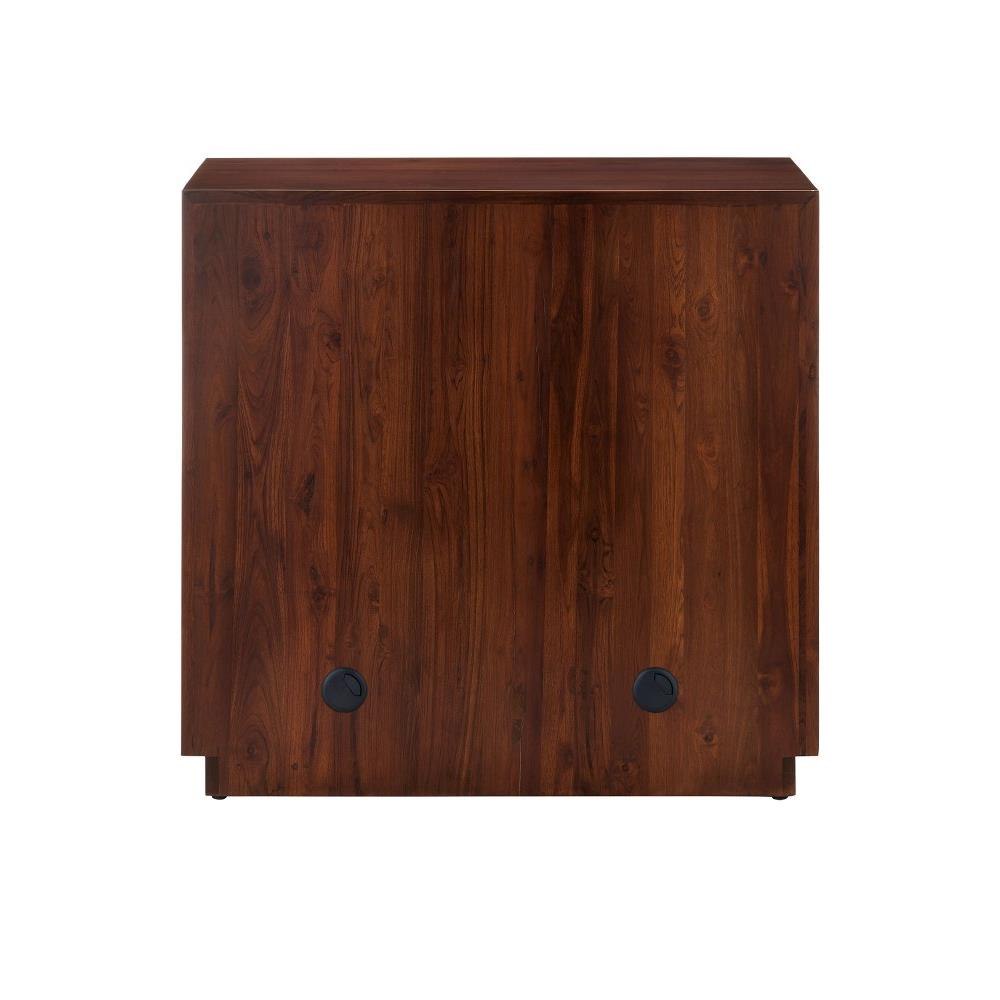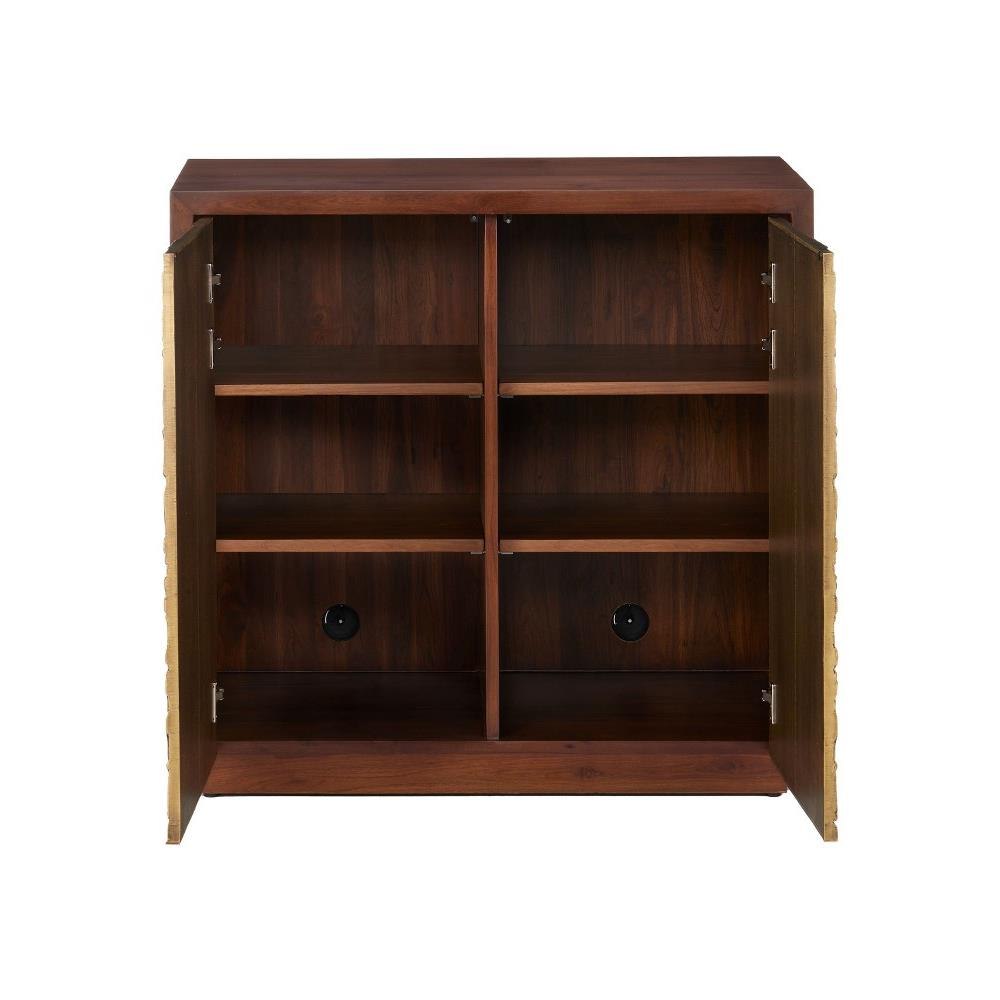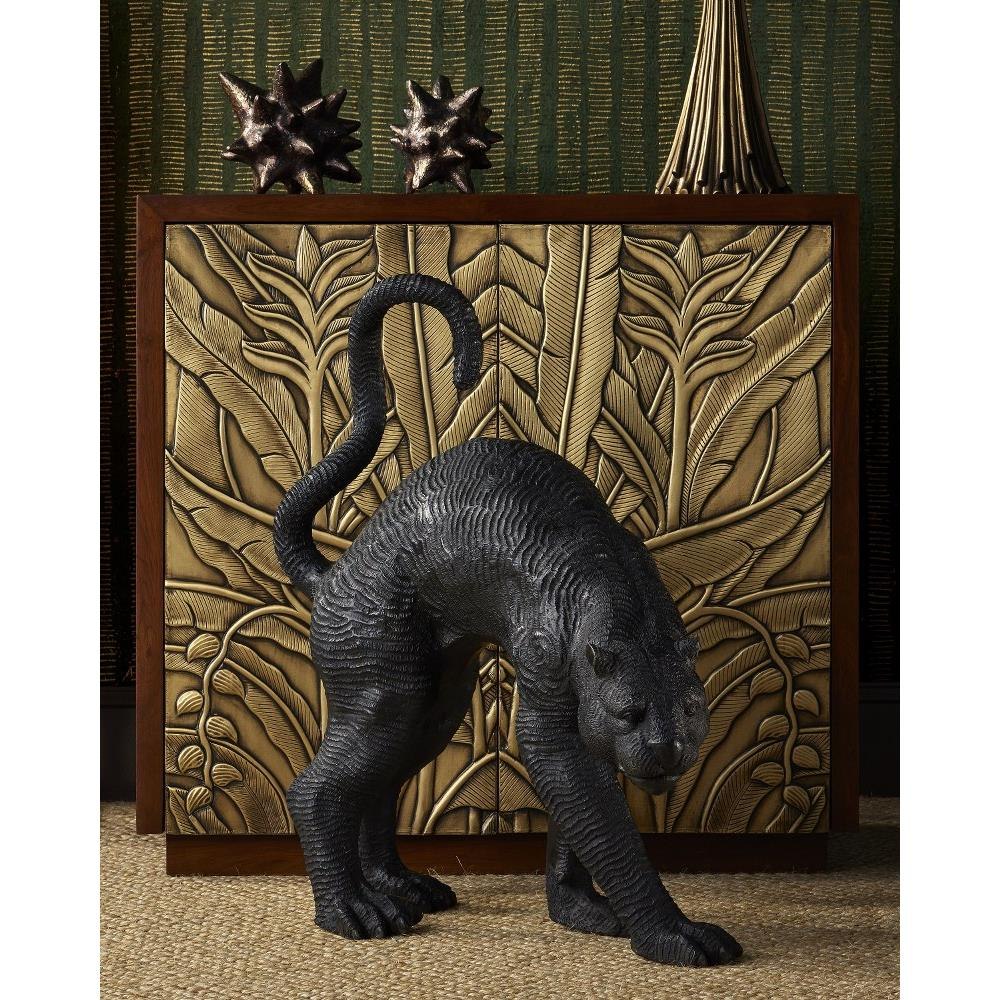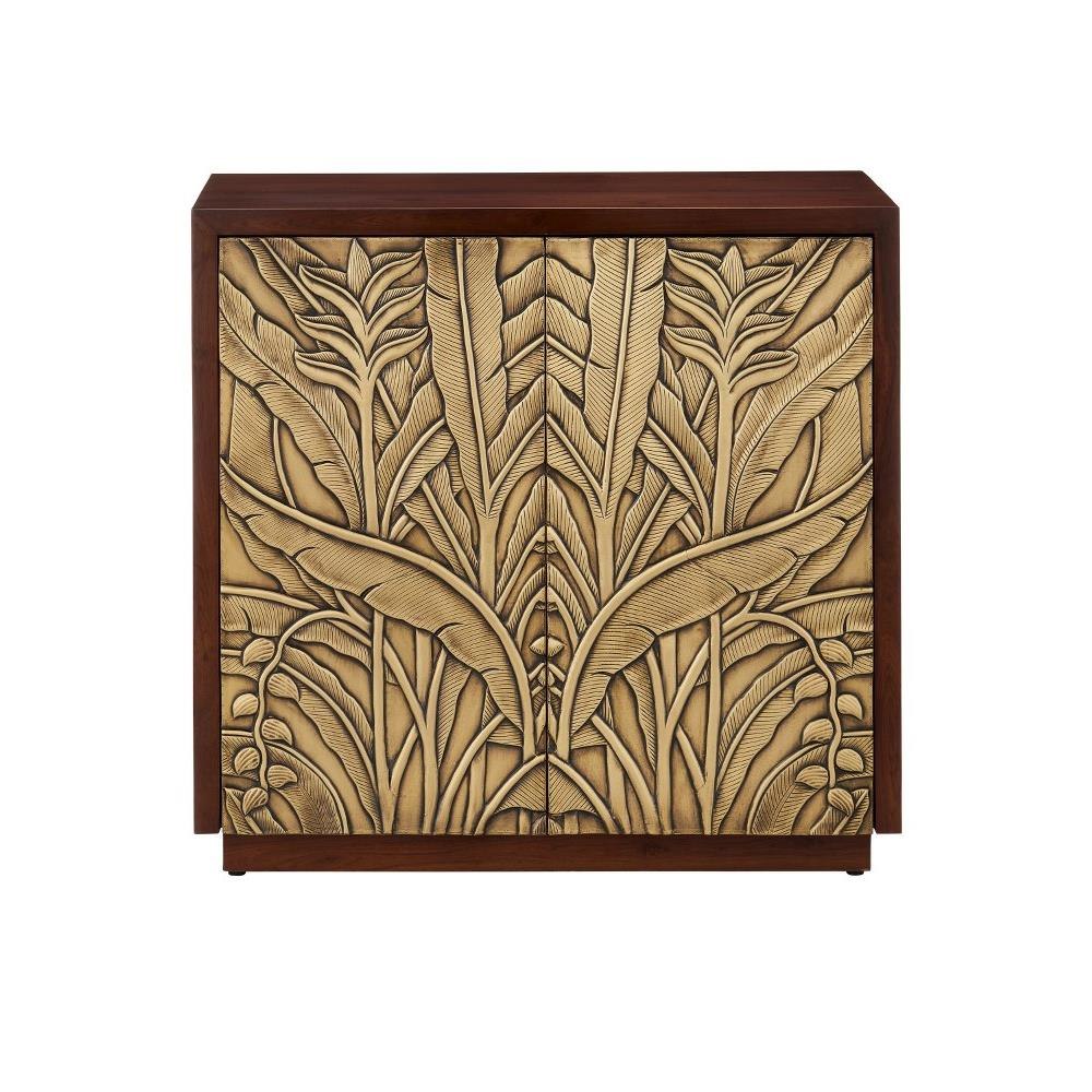The Jardin Cabinet was created in the tradition of repoussage — a painstaking and laborious process that involves creating low-relief panels with raised motifs onto which thin brass sheets are hammered to reveal the visual richness underneath. In this case, the doors and frame are made of reclaimed teak, finished in walm walnut. The metalwork is rendered in an antique brass finish. This is a tall cabinet, standing 38.5 inches high.