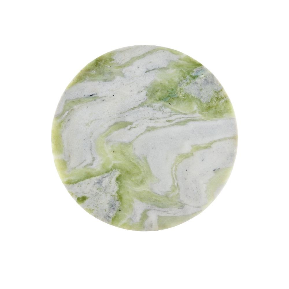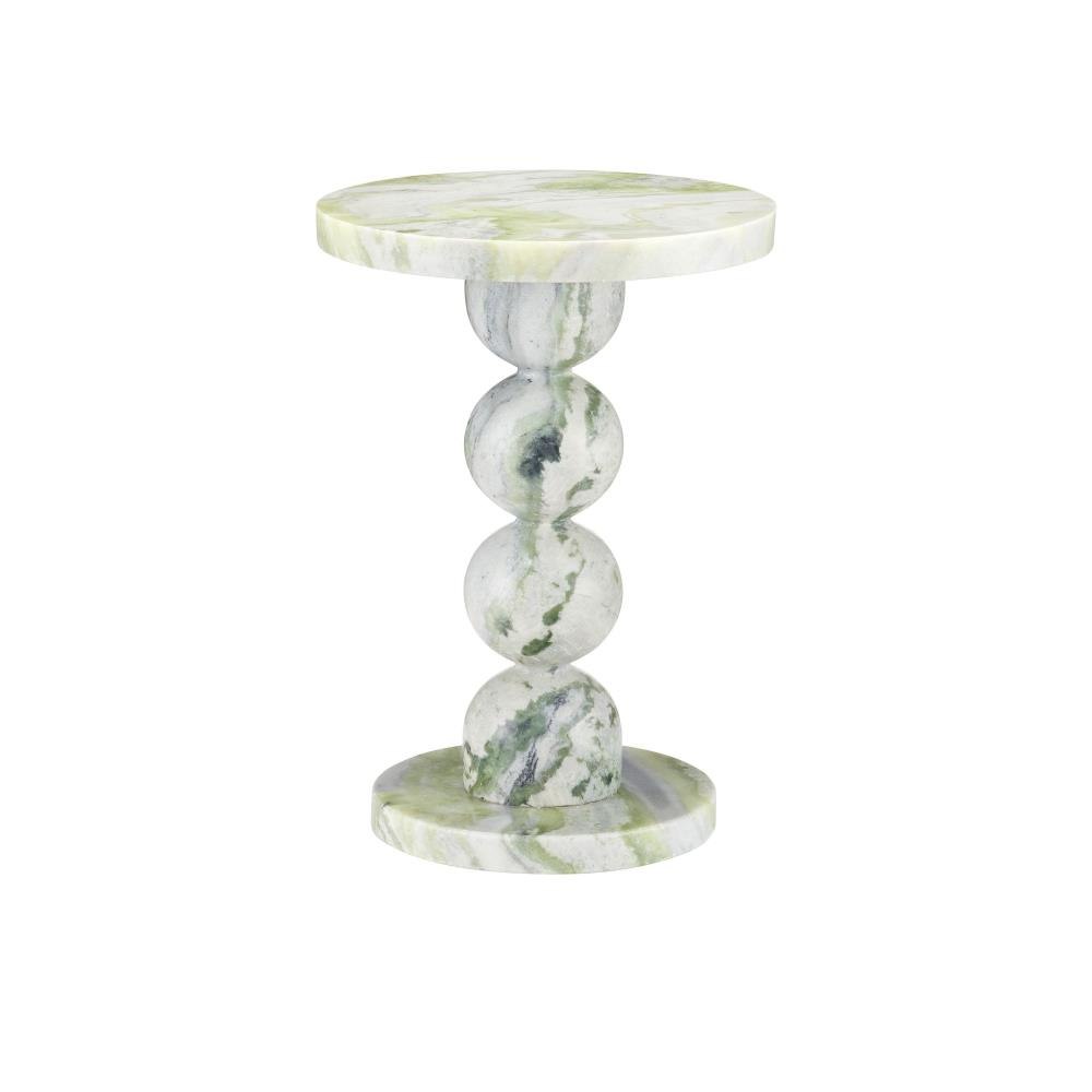 A captivating showcase of natural beauty and refined craftsmanship, the Turner Green Onyx Accent Table is made from richly patterned green onyx, its surface adorned with striking veins of green, gray, and beige that make each piece unique. The pedestal, designed to resemble stacked spheres, is actually a meticulously turned column that gracefully rises from a round base to a slightly larger round top.