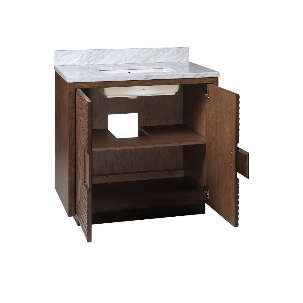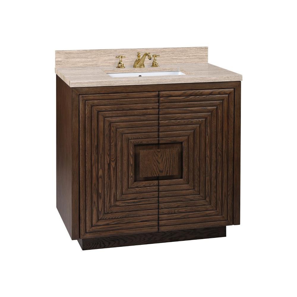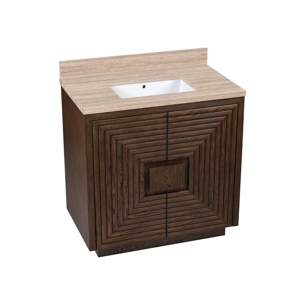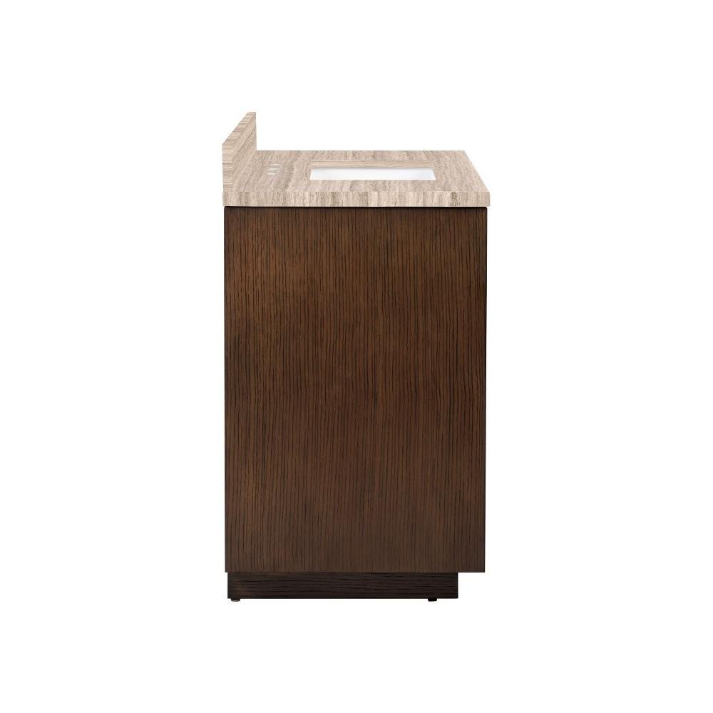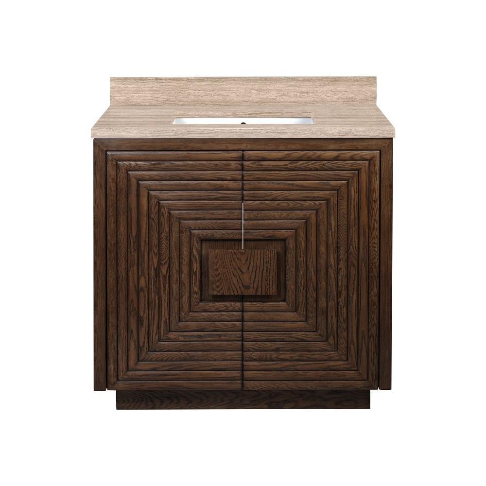 The deep-toned distressed cocoa finish on the Morombe 36" Cocoa Vanity highlights the patterns of natural wood that form embedded squares in a geometric illusion of depth. The interior has one adjustable shelf and there are two optional wood trays that attach to the inside of the doors. The travertine top is fitted with a rectangular undermount sink. Other fine design attributes include soft-close door hinges and a matching marble backsplash.