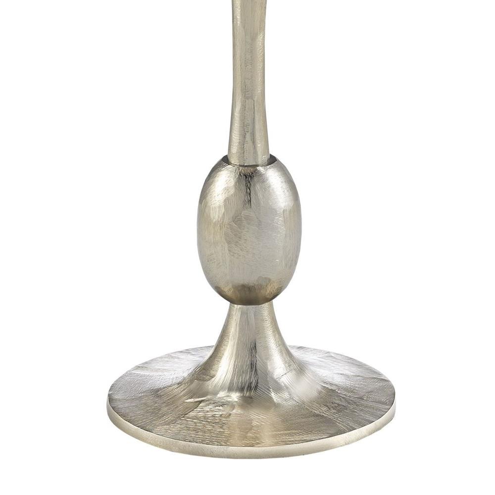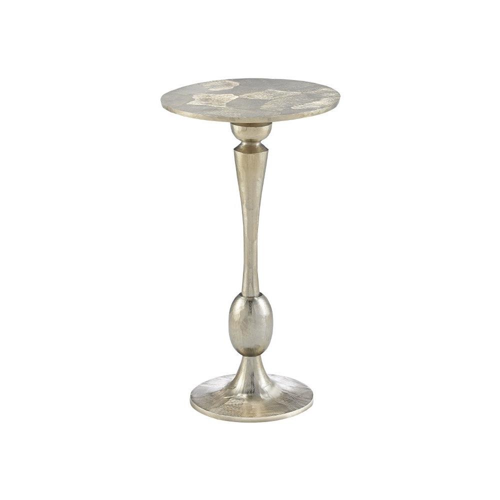 The shape of the Talia Champagne Accent Table is a riff on turned wood candle-sticks, but this silver accent table is made of cast aluminum in a champagne gold finish. We also offer the Talia in a bronze drinks table and a champagne drinks table.Foam Bottom.