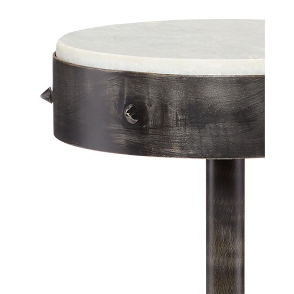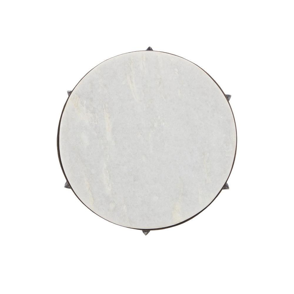 With a hint of industrial style, the Helios Blacks Drinks Table is made of iron in an antique black finish that brings the base, stem, and rim on the tabletop added patina. The design details are geometric - the fluted bulge on the stem and trumpet shape where it meets the base. The spikes on the top surround are reminiscent of medieval armory. We've topped the metal drinks table with a disc of white marble for a nice contrast, the black/white interplay a staple in modern farmhouse style.