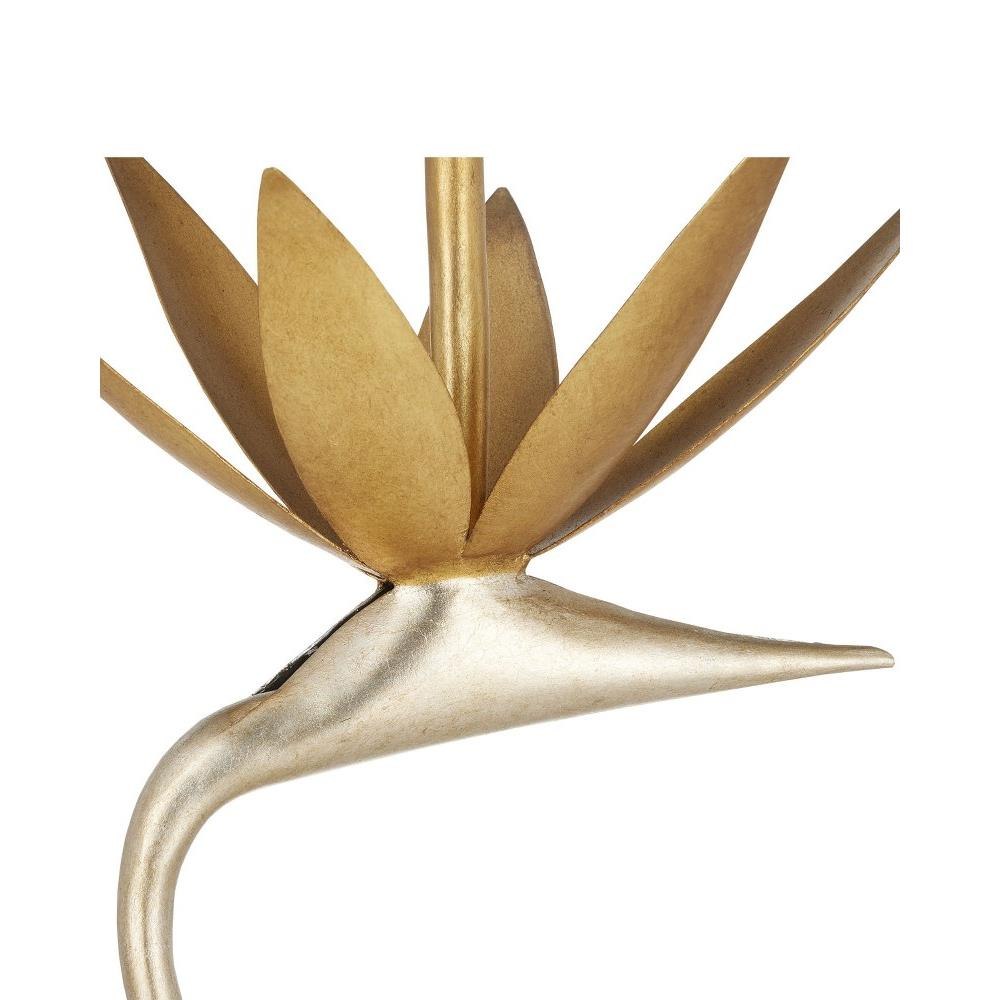 With a body made of steel, the Paradiso Gold & Silver Accent Table has a lyrical shape inspired by the Strelitzia reginae, more commonly known as the Bird of Paradise plant. The limb that arcs up, in a contemporary silver leaf finish, holds a blossom in a contemporary gold leaf finish. The two work in concert to balance the glass top. This silver and gold occasional table is an example of how nature-inspired design elements are driving the biophilic movement.