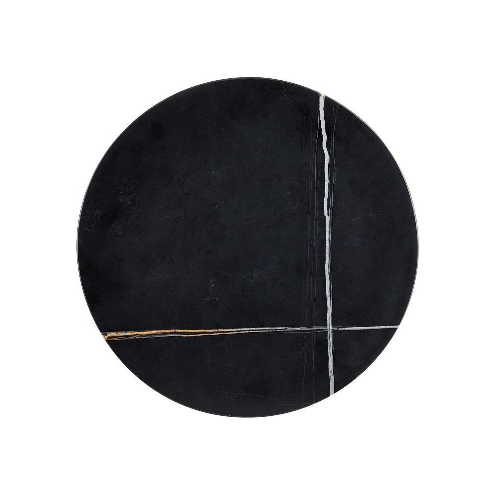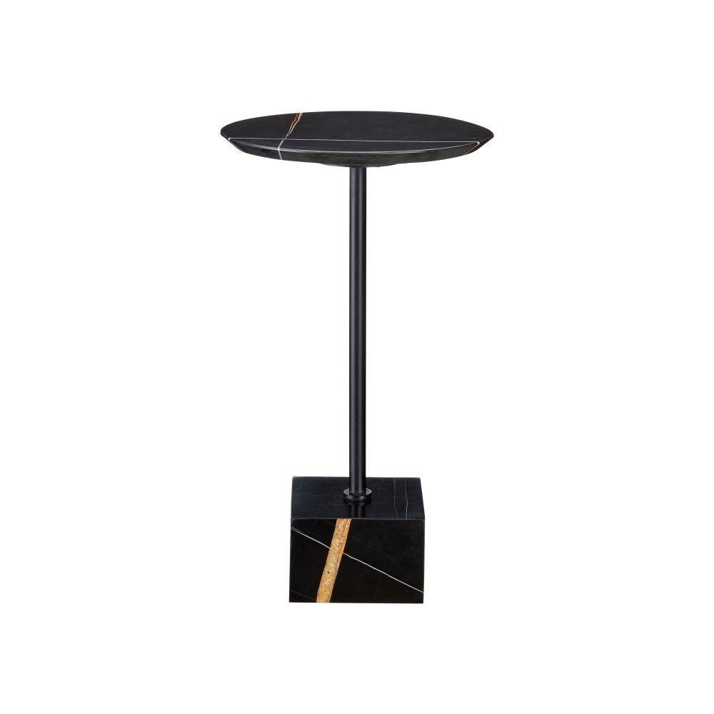 A true masterpiece of Mother Nature's doing, the Prado Drinks Table gleans its personality from the Nero Saint Laurent marble, imported from Italy, that forms its base and top. The striations of color on the blocky piece and the round disc, connected by a metal stem in a black finish, are artfully beautiful.