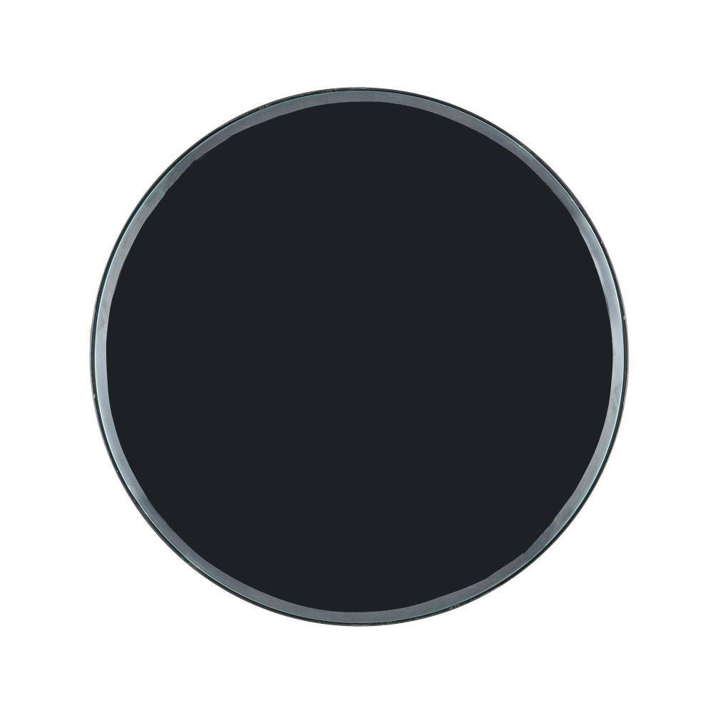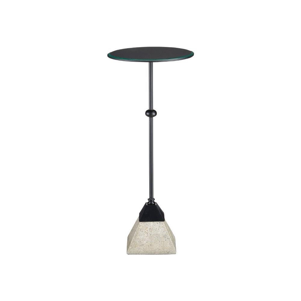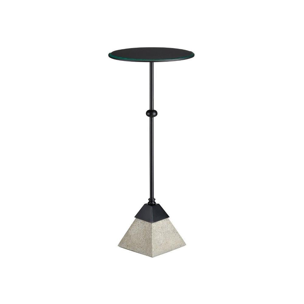 The Parna Concrete Accent Table has a stealth profile created by wrought iron in a satin black finish that rises above a pyramid-shaped base made of polished concrete. An inset clear glass disc with beveled edges fits seamlessly into the top.