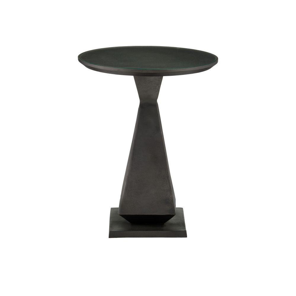 The Janil Accent Table is a generously sized side table forged from cast aluminum with a handsome graphite finish. The geometric shape will make it a striking decorative element in a room while the glass inset into its top will bring confidence that morning coffee or evening wine can be sipped without concerns.