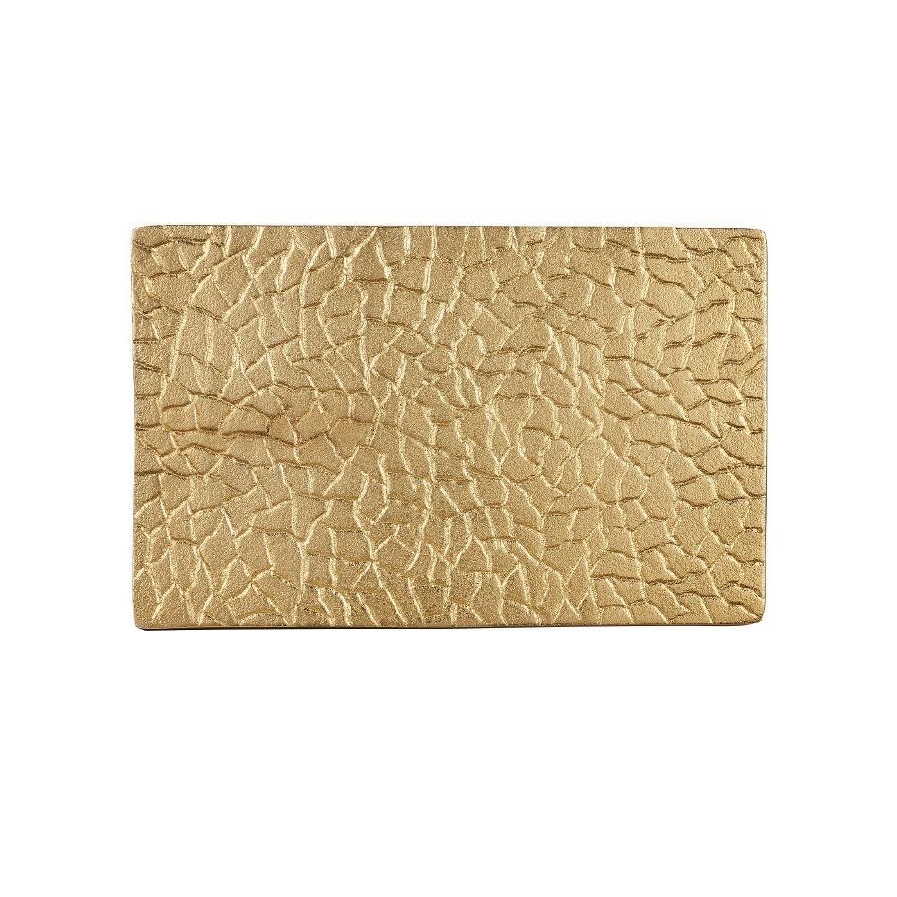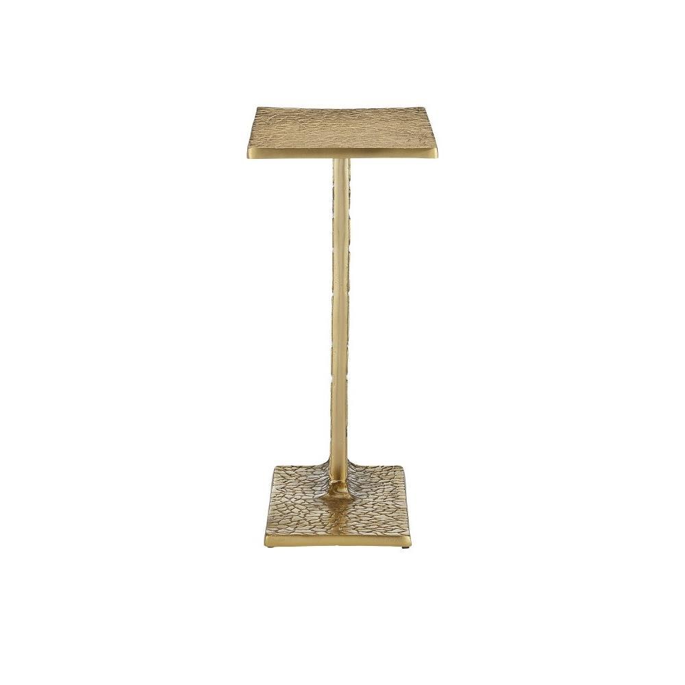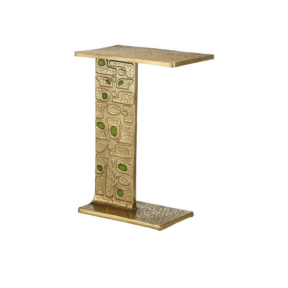 Inspired by a 1940s design, the Beau Monde Gold & Green C Table has textural shapes made of aluminum in a gold finish, ornamented with green enamel lozenges that create a lively pattern along the sides of the pedestal. Inspired by a mirror seen at a French flea market, the gold accent table has the same patterning on its top and base.
