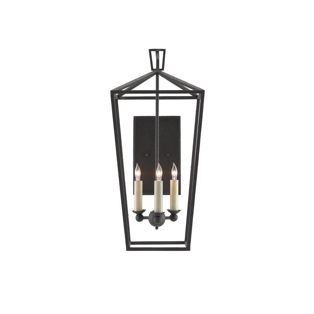 The Denison Wall Sconce is a hammered wrought-iron fixture in a Mole black finish. The classic lantern shape has stood the test of time to make it one of our most popular offerings. A design element of note is the square that fastens the lantern to the chain. This black sconce, certified for damp locations, is one of a number of sizes and finishes in the Denison family.