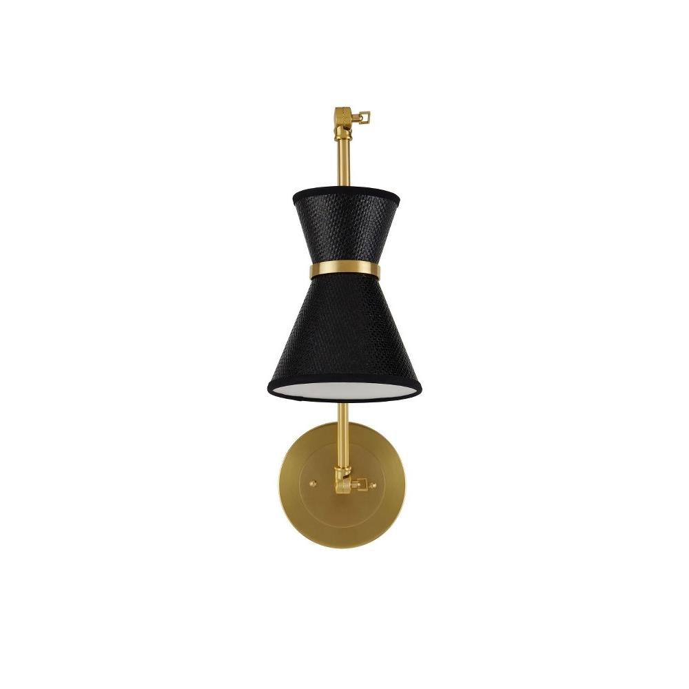 The Avignon Wall Sconce was created by Suzanne Duin, who founded the Houston shop and design studio Maison Maison, and is known for a keen eye in sourcing authentic French antiques and home accessories from around the globe. Each piece in her line of woven light fixtures is handmade by artisans in Southeast Asia; the Avignon an example with black paper shades in a tight weave and steel in a polished brass finish. This chic wall sconce is suspended from adjustable gold rods with a matching circlet at the narrowest point on the shade, bringing both texture and French flair.