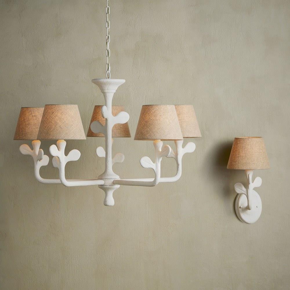 The playful profile of the Charny Wall Sconce makes this a charming addition to a room. The contemporary white wall sconce is made of composite with a Gesso White finish. The leaf-like shapes that extend from the stem of the Charny make this a terrific luminary for a space inspired by nature. The white sconce is topped with a textural natural shade in a coarse linen.