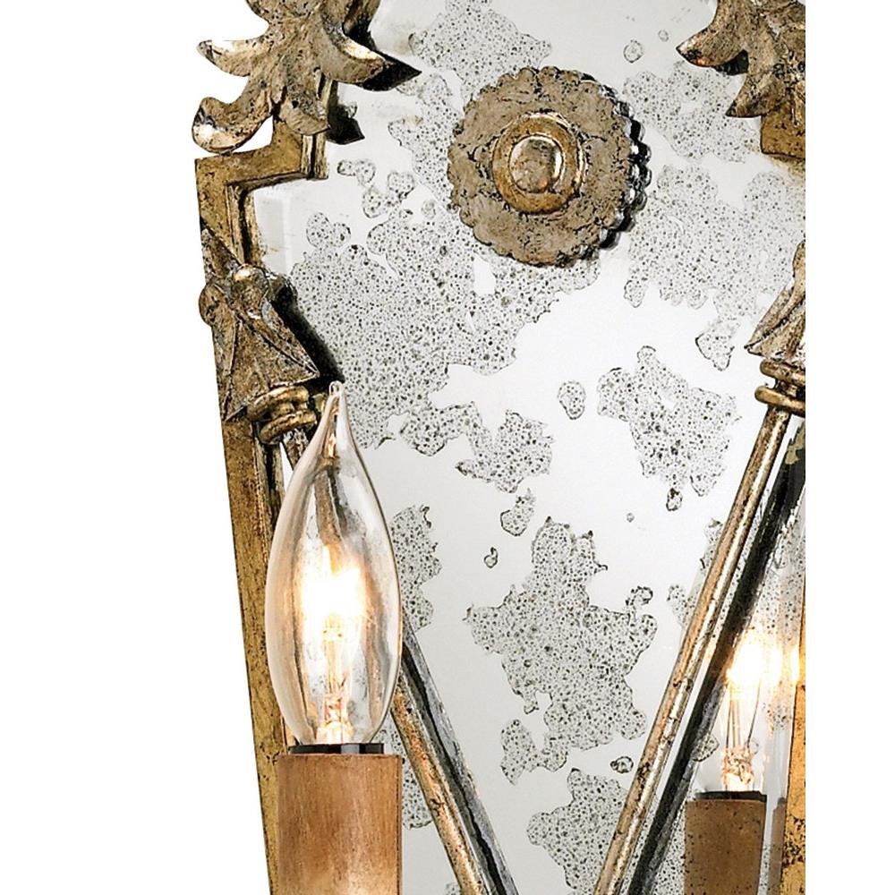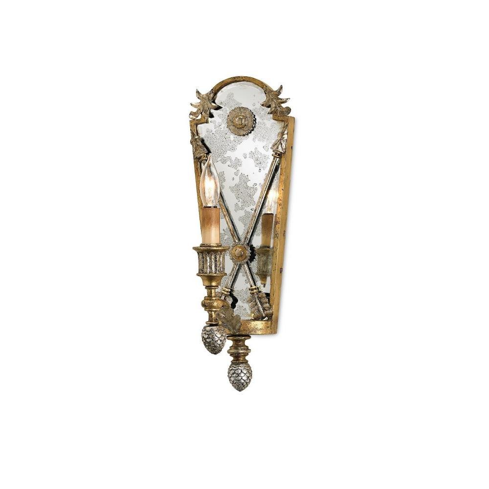 The Napoli Wall Sconce is graced with arrow and acorn accents. Made of wrought iron in gold leaf and majestic silver leaf finishes, the sconce has a reflective profile given antique mirror is applied to its wall plate. The gold sconce is in the Lillian August Collection.