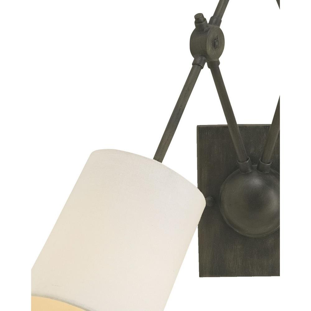 The angular arms and black Iron finish on the Compass Wall Sconce hold references popular during the Industrial Age. The rings that connect the arms on this black sconce have a machined feel to them, appearing as if they could raise the two white linen shades that angle away from each other.