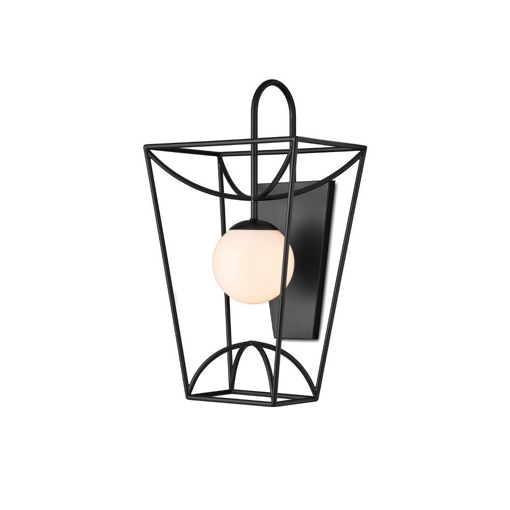 The Rochefort Small Wall Sconce is an outdoor fixture with beautiful lines that subtly draw themselves into a lantern-like form. The black powder-coated finish makes it durable for exterior environments and contrasts the milky white glass globe that it balances in its center. Whereas traditional lanterns may be limited to time-honored and transitional design aesthetics, the delicacy of the profile of this black outdoor sconce makes it fitting for mid-century modern homes and those that lean contemporary.