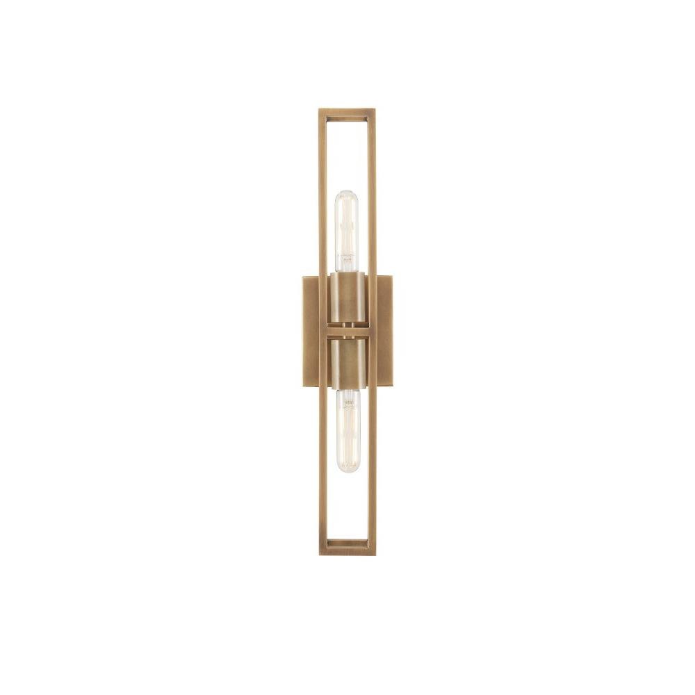 Floating within an elongated cage, the two bulbs that illuminate the Bergen Brass Wall Sconce are as lean as the overall profile of the gold sconce. Made of metal in an antique brass finish, the Bergen has a sophistication to its lines given they are pared down and perfectly formed. This wall sconce is ADA compliant and certified for damp locations. Part of the Bagno Collection of wall sconces designed for bathroom spaces.