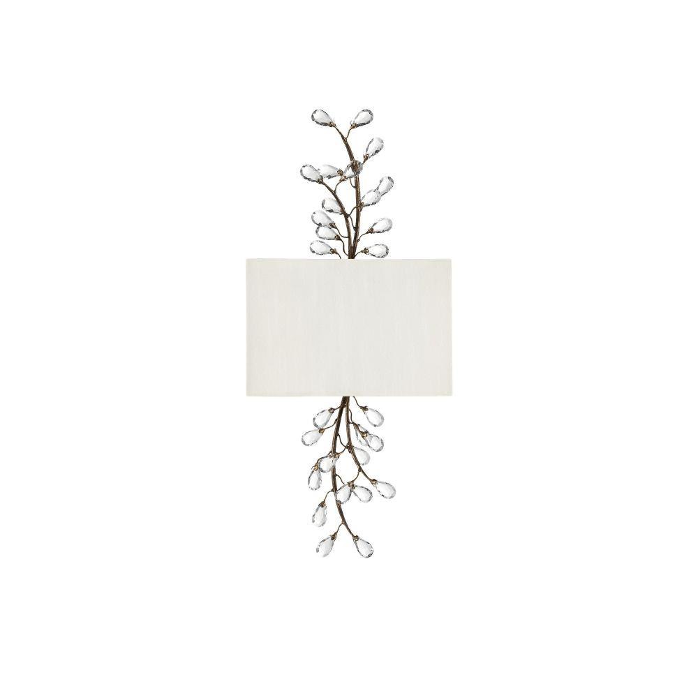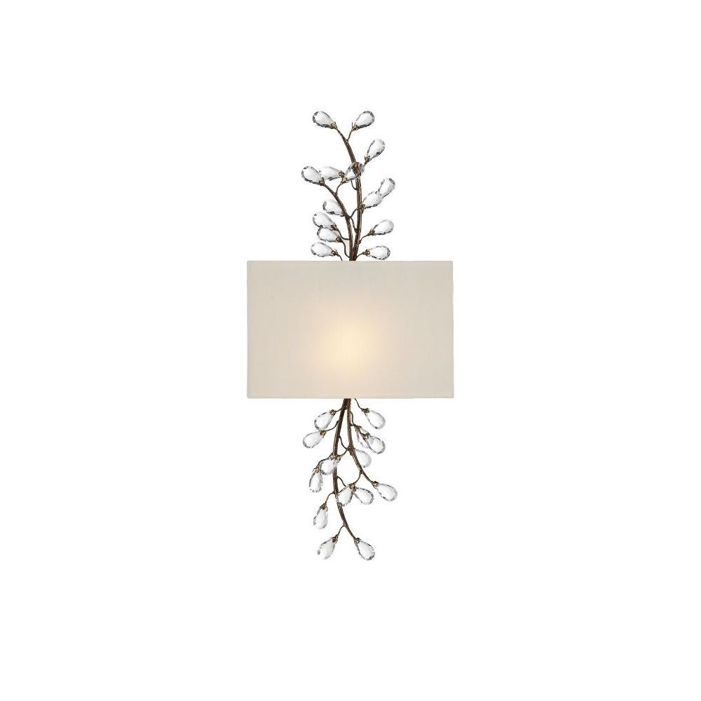 The Crystal Bud Tall Wall Sconce has delicate faceted crystals unfurling from vines that flow above and below its shade. The rust-colored metal in a Cupertino finish serves as a warm contrast to the luminous glass; the interplay making the profile of this crystal sconce complex and interesting. This is one of the fixtures in the varied Crystal Bud family of lights. The crystal sconce has a beautifully placed rectangular shade made of off-white shantung to make the fixture ADA compliant.