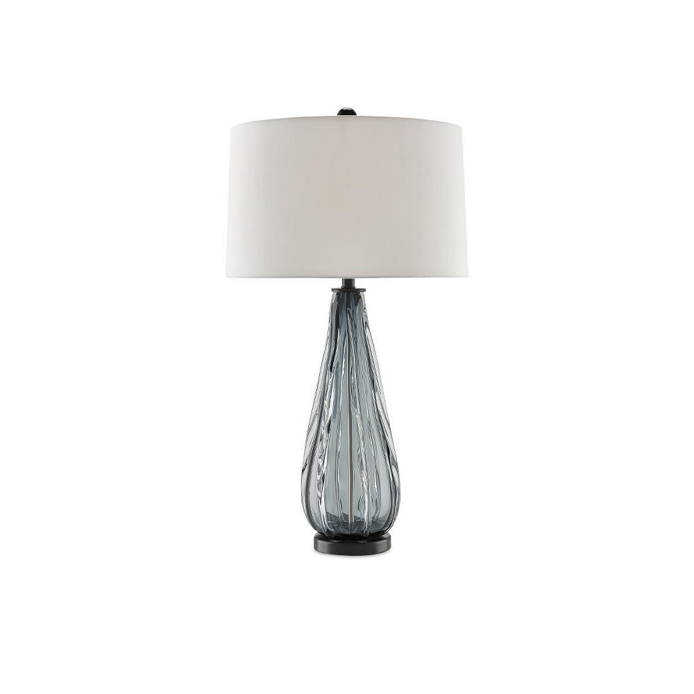 The Nightcap Table Lamp is stylishly stunning with its column of glass that is hand-formed with vertical ribbing on the surface. Complementing the blue-gray blown glass is satin black hardware that brings out the fixture's smoky tones. The blue table lamp is topped with an off-white shantung shade.