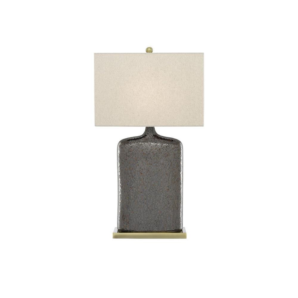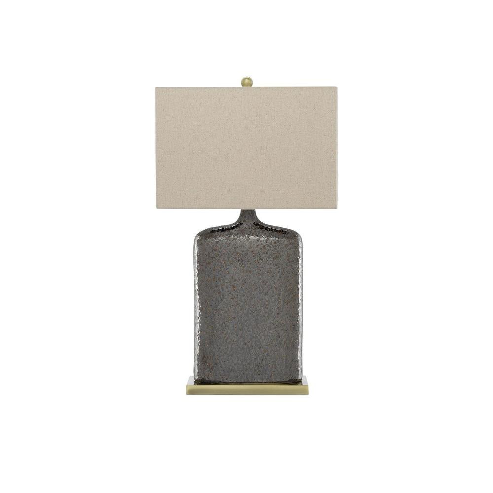 The rustic metallic bronze glaze on the Musing Table Lamp has natural pitting to add interest to the flask-like shape. The shallow depth of the elongated body, a metal plinth-like base in a bronze finish, and a khaki linen shade coalesce to bring the bronze lamp a rough luxe vibe.