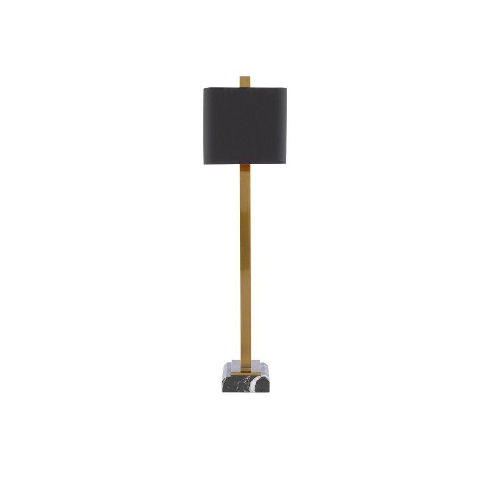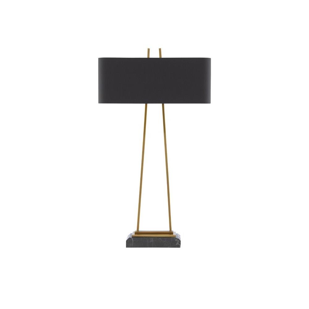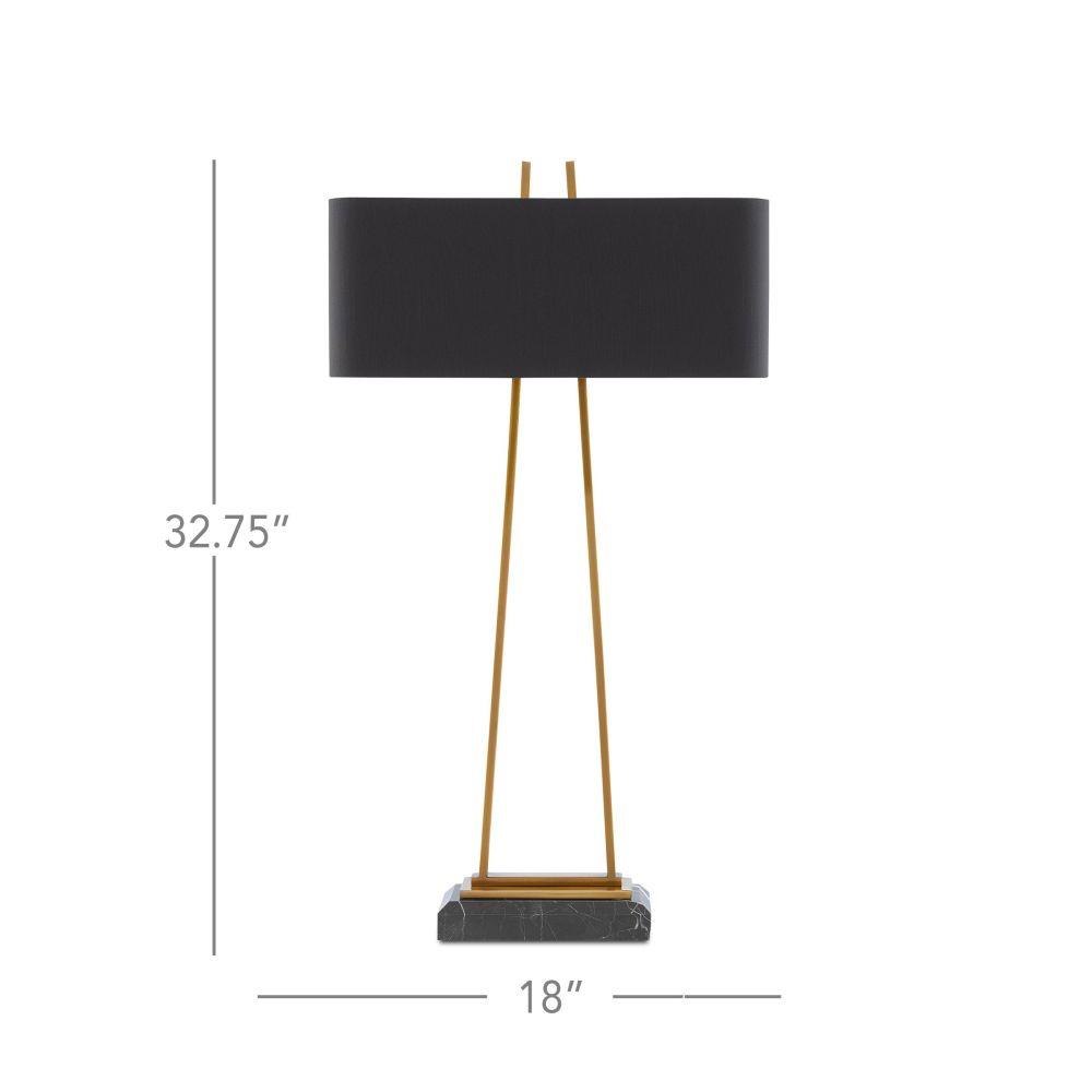 Our Adorn Large Table Lamp has a thin metal frame in an antique brass finish that culminates with an unfinished pyramid shape in the matching finial. The black marble base is a luxurious touch and the black shantung shade with its gold lining brings this gold lamp added beauty. We also offer the Adorn in a smaller size.