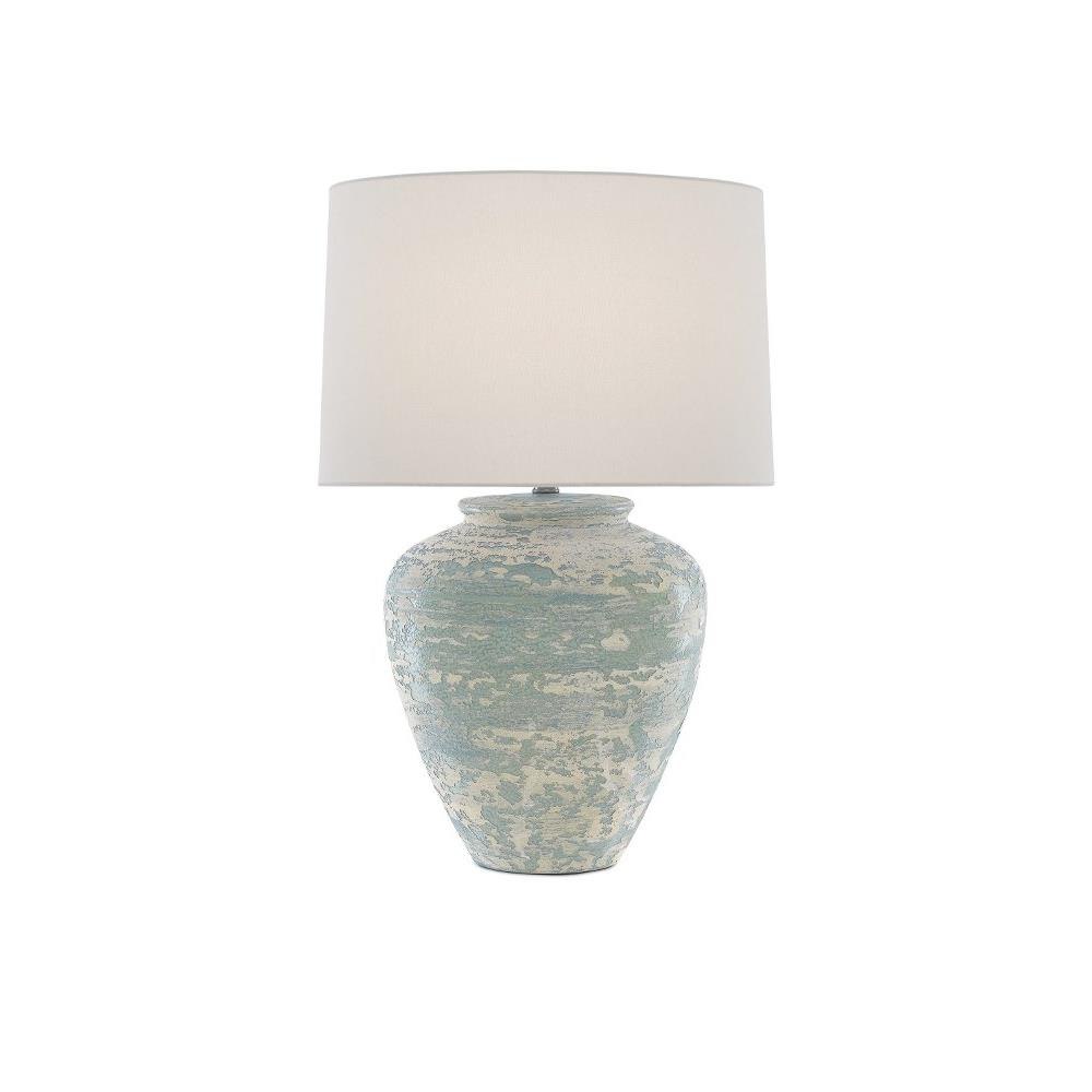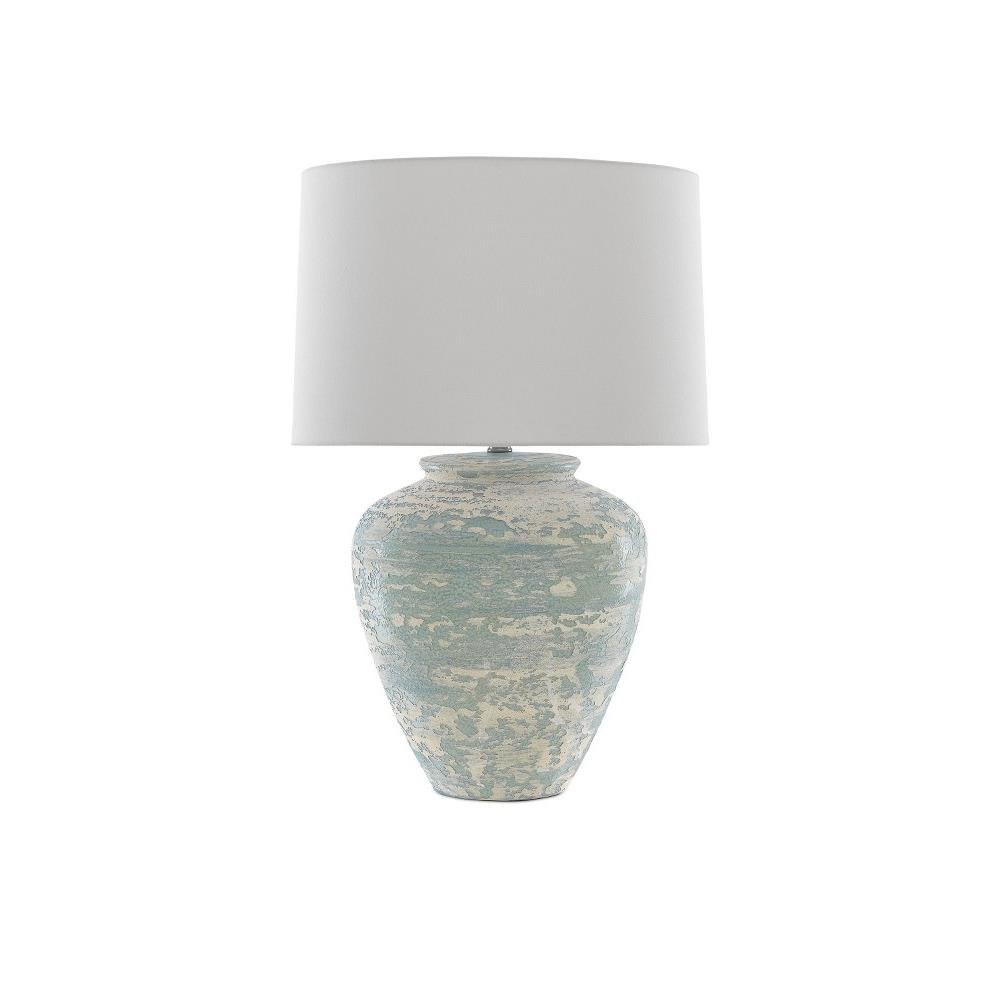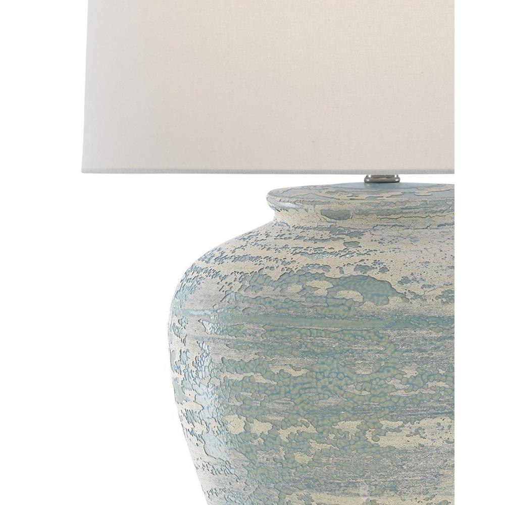 The ginger-jar shape of the Mimi Table Lamp is just one of its lovely features: the aqua and cream surface is another. The turquoise lamp, which will bring textural patina to a room, is topped with a white shantung shade.