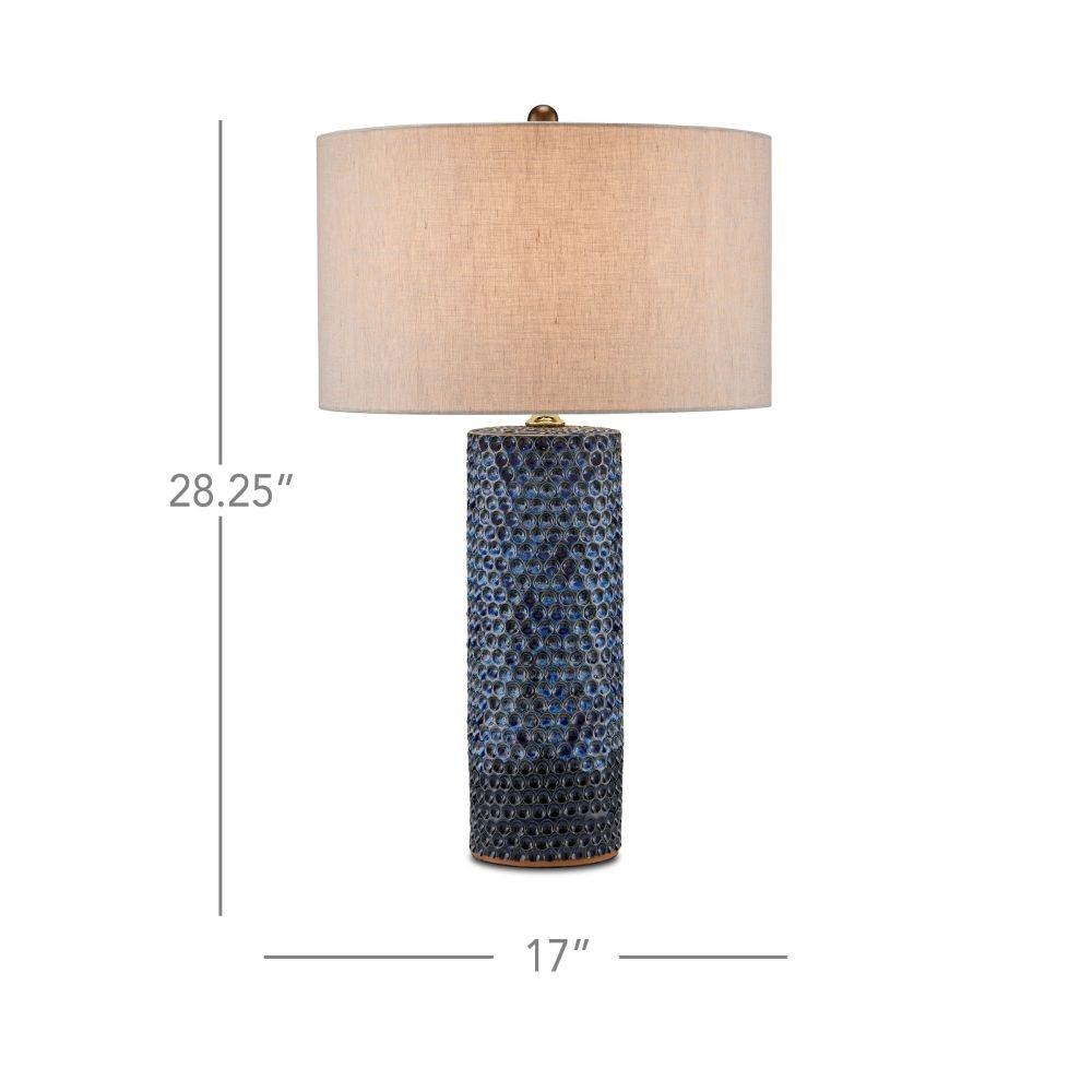 The Polka Dot Ivory Table Lamp has a columnar ceramic body with a flowing pattern of circular shapes pressed into it, creating drifts of polka dots. Covered in a reactive glaze, the beige table lamp has added depth and texture when the terra cotta color of the natural material shows through. A metal finial holds the natural linen shade in place.