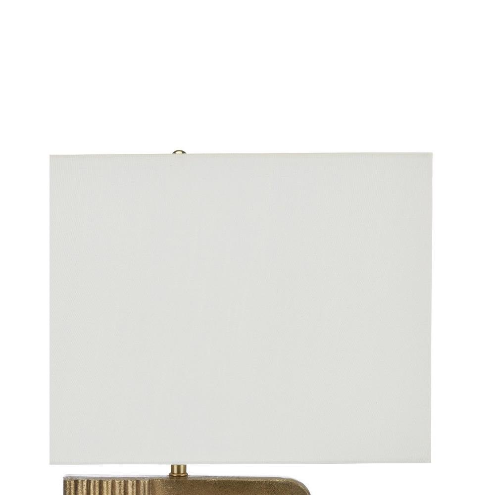 Designed by Ian Thornton, who was inspired by Art Deco motifs from the 1920s and 1930s when he conceived the Thebes Table Lamp, the cast aluminum composition has a warm antique brass finish. The artful face with its expression that calls to mind both Egyptian and Parisian deco influences, looks into a room with its canny stare from both sides of the gold table lamp so it can be placed in the center of a space. The rectangular white shantung shade is perfectly in scale with the elongated metal body.