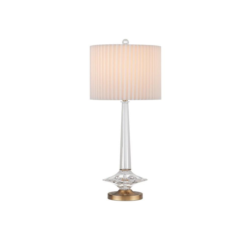 The Anton Table Lamp is made of lustrous optic crystal contrasted by metal accents in an antique brass finish. This includes the round base that beautifully supports a hexagonal swell and a thin ring of metal that cinches the geometric accent at the bottom of a thin stem, which narrows as it reaches the knife-pleated shade. A brilliant optic crystal finial attaches it to the clear lamp.