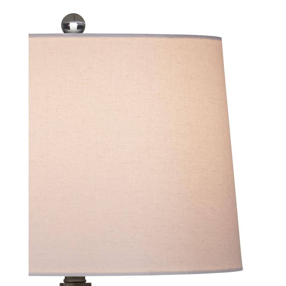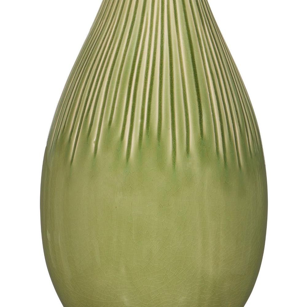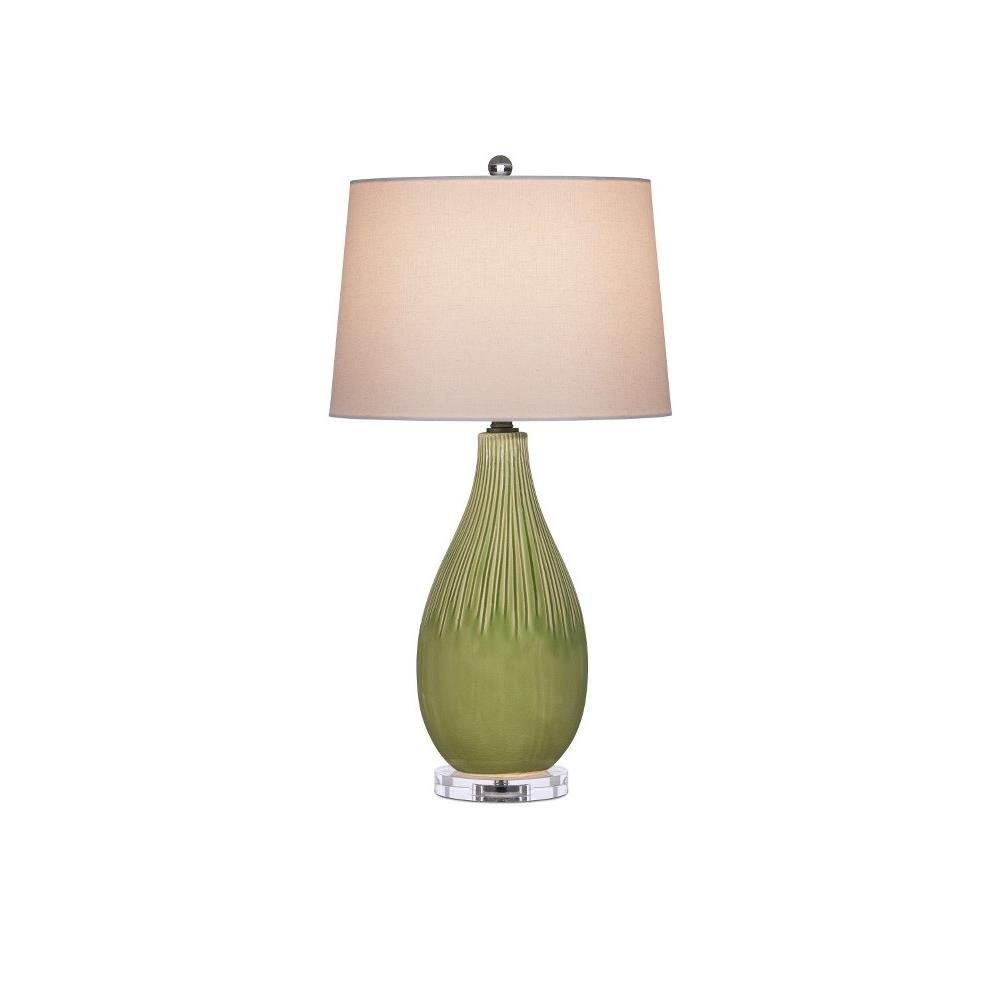 The Anjou Table Lamp is a glamorous creation made of ceramic with a rich green glazing that has been artfully applied to flow seamlessly down from the striations that are carved into the top section of the pear-shaped lamp. The optic crystal base and finial are luminous accents, and the satin brass finish on the hardware is warm in tone, as is the linen natural shade that tops the green lamp.